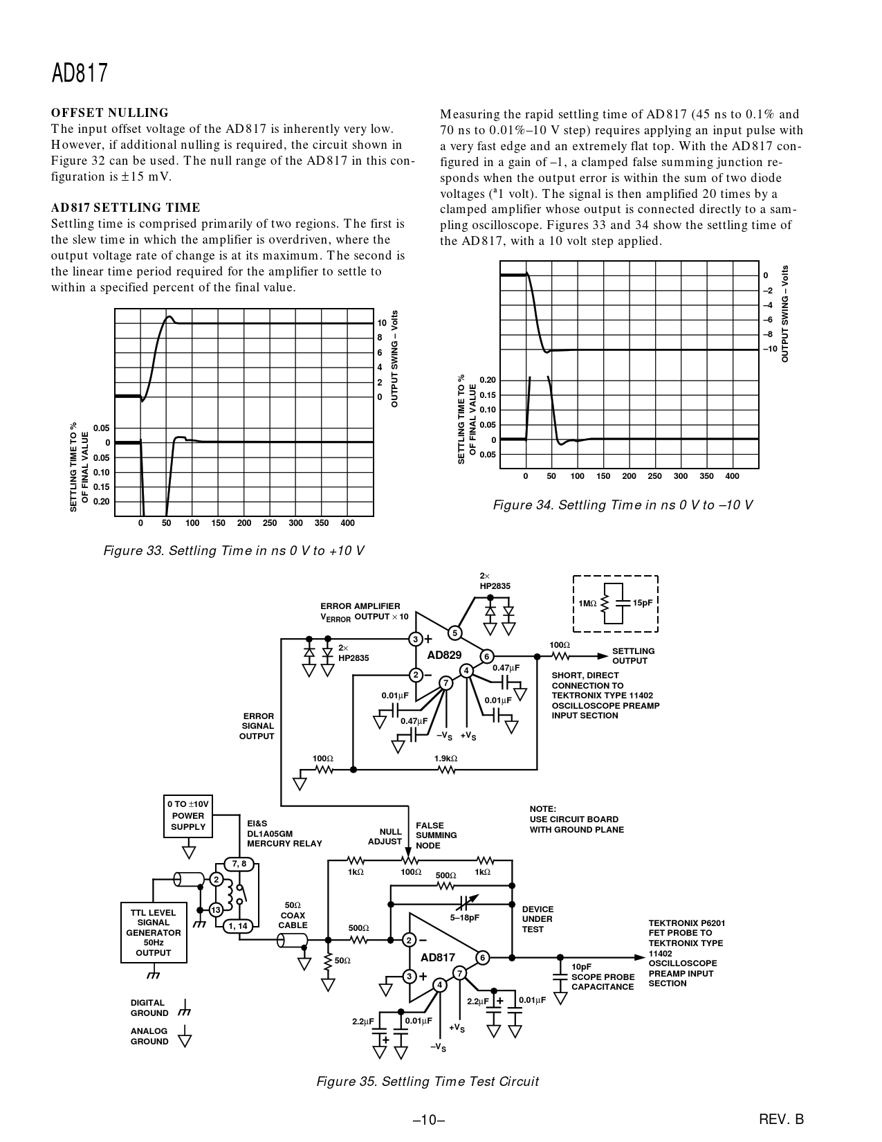 AD817OFFSET NULLING Measuring the rapid settling time of AD817 (45 ns to 0.1% and The input offset voltage of the AD817 is inherently very low. 70 ns to 0.01%–10 V step) requires applying an input pulse with However, if additional nulling is required, the circuit shown in a very fast edge and an extremely flat top. With the AD817 con- Figure 32 can be used. The null range of the AD817 in this con- figured in a gain of –1, a clamped false summing junction re- figuration is ± 15 mV. sponds when the output error is within the sum of two diode voltages (ª1 volt). The signal is then amplified 20 times by a AD817 SETTLING TIME clamped amplifier whose output is connected directly to a sam- Settling time is comprised primarily of two regions. The first is pling oscilloscope. Figures 33 and 34 show the settling time of the slew time in which the amplifier is overdriven, where the the AD817, with a 10 volt step applied. output voltage rate of change is at its maximum. The second is the linear time period required for the amplifier to settle to 0 within a specified percent of the final value. –2–410–68–86–10OUTPUT SWING – Volts420.2000.15OUTPUT SWING – Volts0.100.050.0500OF FINAL VALUE0.050.05SETTLING TIME TO %0.100501001502002503003504000.15OF FINAL VALUE 0.20 Figure 34. Settling Time in ns 0 V to –10 V SETTLING TIME TO %050100150200250300350400 Figure 33. Settling Time in ns 0 V to +10 V 2 × HP2835ERROR AMPLIFIER1M Ω 15pFVOUTPUT × 10ERROR53100 Ω 2 × HP2835AD829SETTLING6OUTPUT0.47 µ F42SHORT, DIRECT7CONNECTION TO0.01 µ FTEKTRONIX TYPE 114020.01 µ FOSCILLOSCOPE PREAMPERRORINPUT SECTION0.47 µ FSIGNALOUTPUT–V+VSS100 Ω 1.9k Ω 0 TO ± 10VNOTE:POWERUSE CIRCUIT BOARDFALSESUPPLYEI&SWITH GROUND PLANENULLDL1A05GMSUMMINGADJUSTMERCURY RELAYNODE7, 81k Ω 100 Ω 500 Ω 1k Ω 250 Ω 13DEVICETTL LEVELCOAX5–18pFUNDERSIGNALTEKTRONIX P62011, 14CABLE500 Ω TESTGENERATORFET PROBE TO50Hz2TEKTRONIX TYPEOUTPUT50 Ω AD81711402610pFOSCILLOSCOPE37SCOPE PROBEPREAMP INPUT4CAPACITANCESECTION2.2DIGITAL µ F0.01 µ FGROUND2.2 µ F0.01 µ F+VSANALOG GROUND–VS Figure 35. Settling Time Test Circuit –10– REV. B