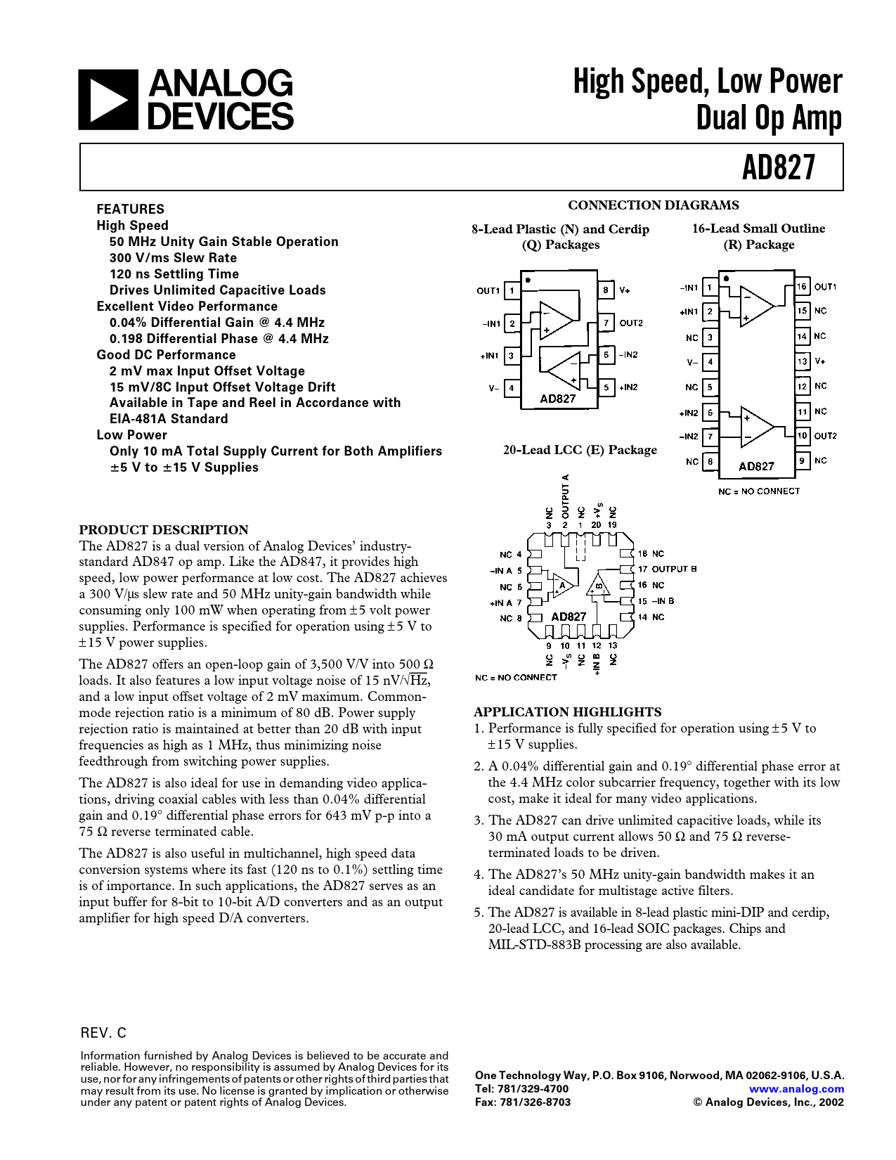 High Speed, Low Power Dual Op Amp AD827 CONNECTION DIAGRAMS FEATURES High Speed 8-Lead Plastic (N) and Cerdip 16-Lead Small Outline 50 MHz Unity Gain Stable Operation (Q) Packages (R) Package 300 V/ms Slew Rate 120 ns Settling Time Drives Unlimited Capacitive Loads Excellent Video Performance 0.04% Differential Gain @ 4.4 MHz 0.198 Differential Phase @ 4.4 MHz Good DC Performance 2 mV max Input Offset Voltage 15 mV/8C Input Offset Voltage Drift Available in Tape and Reel in Accordance with EIA-481A Standard Low Power Only 10 mA Total Supply Current for Both Amplifiers 20-Lead LCC (E) Package