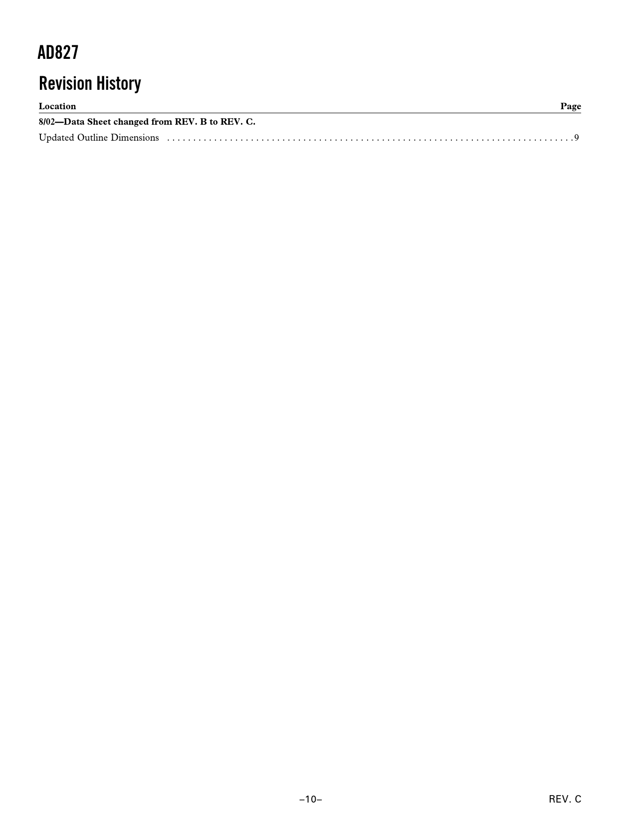 页数 / 页12 / 10 — AD827. Revision History. Location. Page. 8/02—Data Sheet changed from …