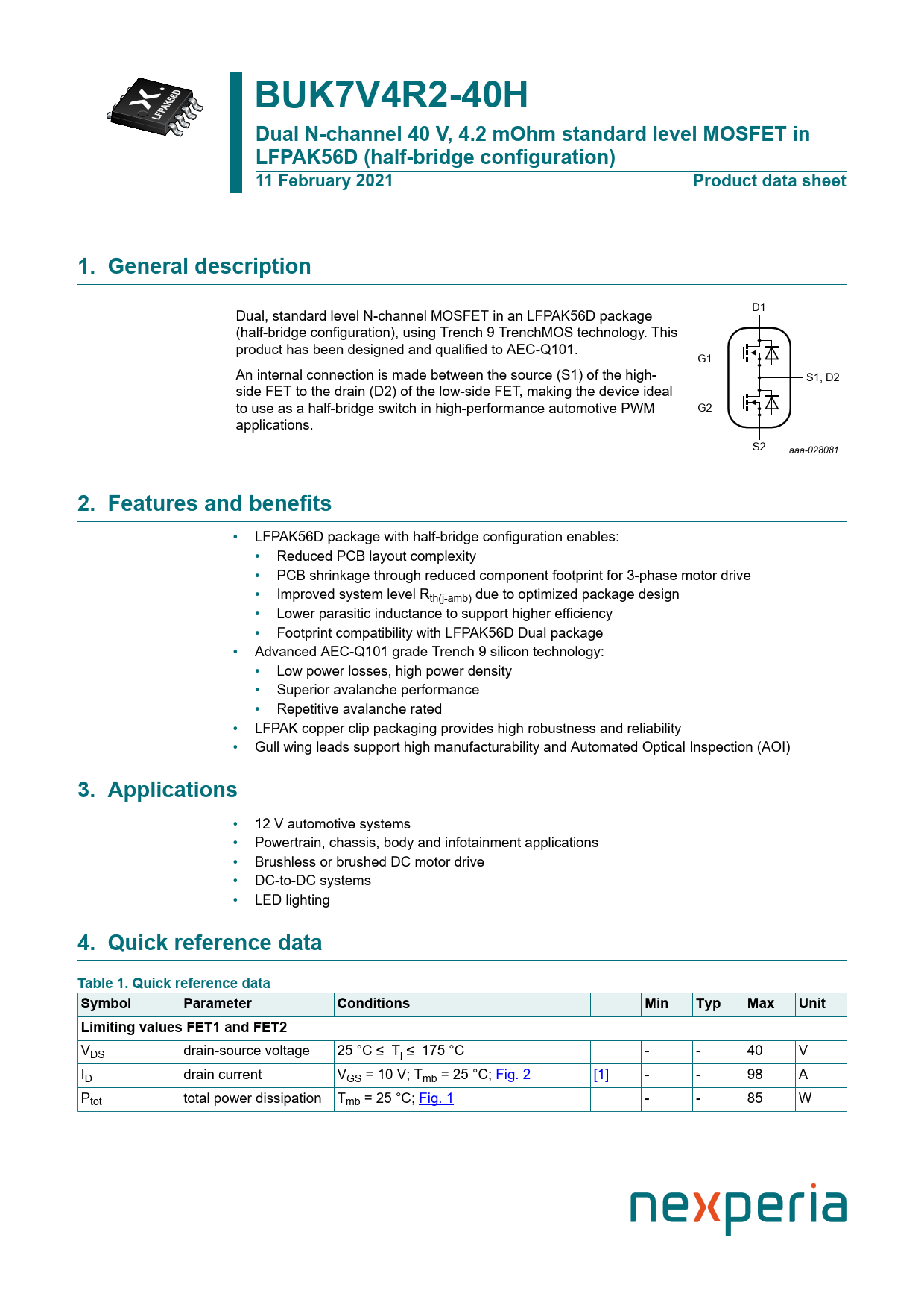 BUK7V4R2-40H Dual N-channel 40 V, 4.2 mOhm standard level MOSFET in LFPAK56D (half-bridge configuration) 11 February 2021 Product data sheet 1. General description