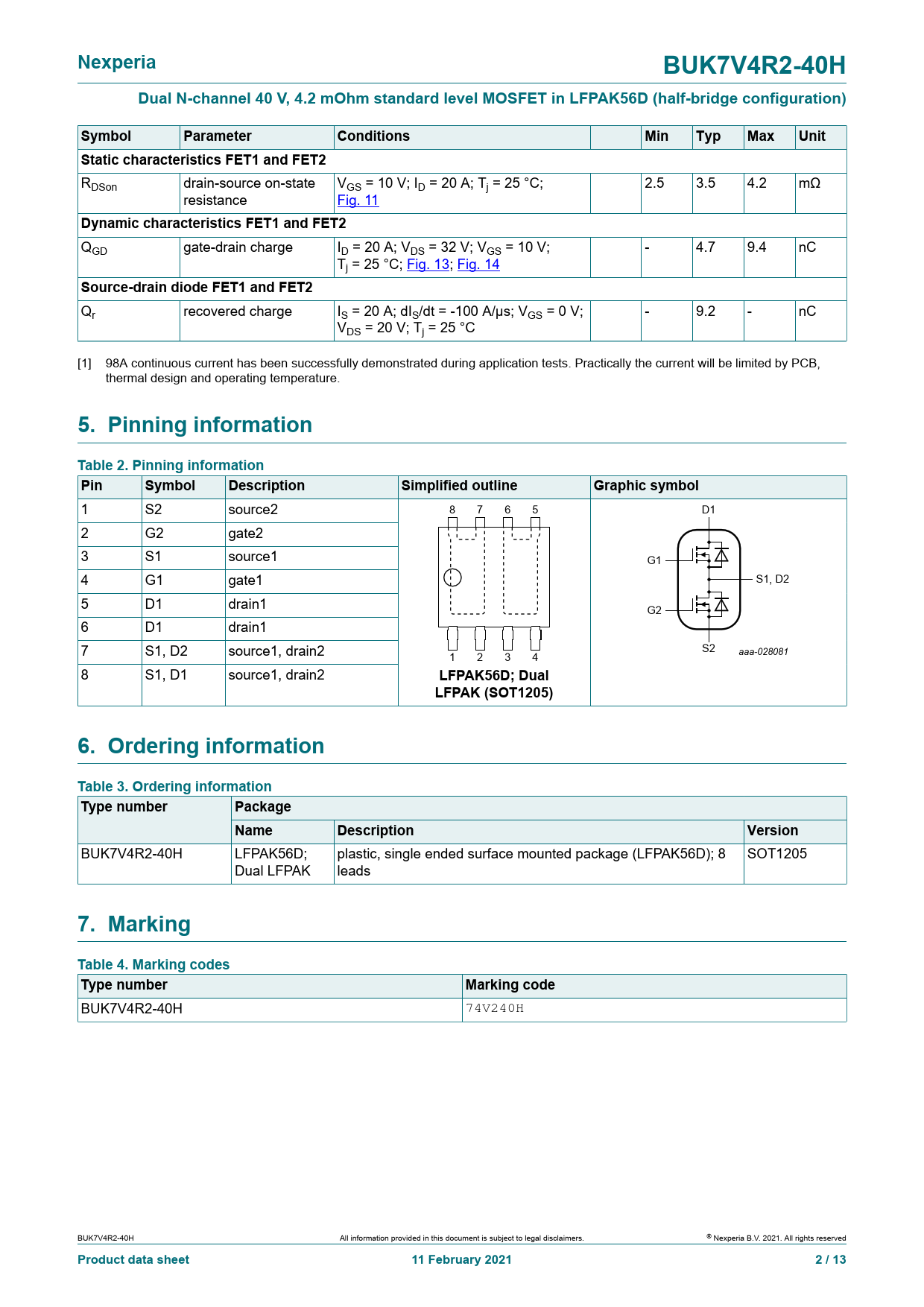 LFPAK56D; Dual LFPAK (SOT1205) 6. Ordering information Table 3. Ordering information Type number Package Name Description Version