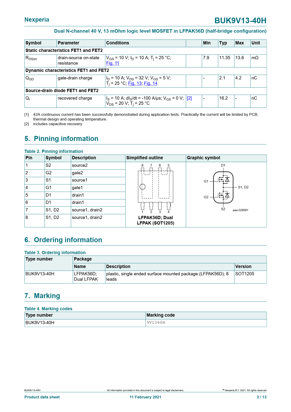 | 页数 / 页 | 13 / 2 — Nexperia. BUK9V13-40H. Dual N-channel 40 V, 13 mOhm logic level MOSFET in … |