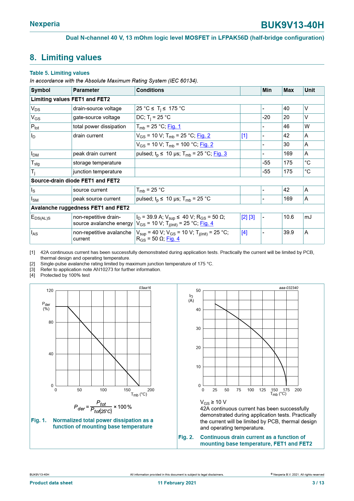 Nexperia BUK9V13-40H Dual N-channel 40 V, 13 mOhm logic level MOSFET in LFPAK56D (half-bridge configuration) 8. Limiting values Table 5. Limiting values