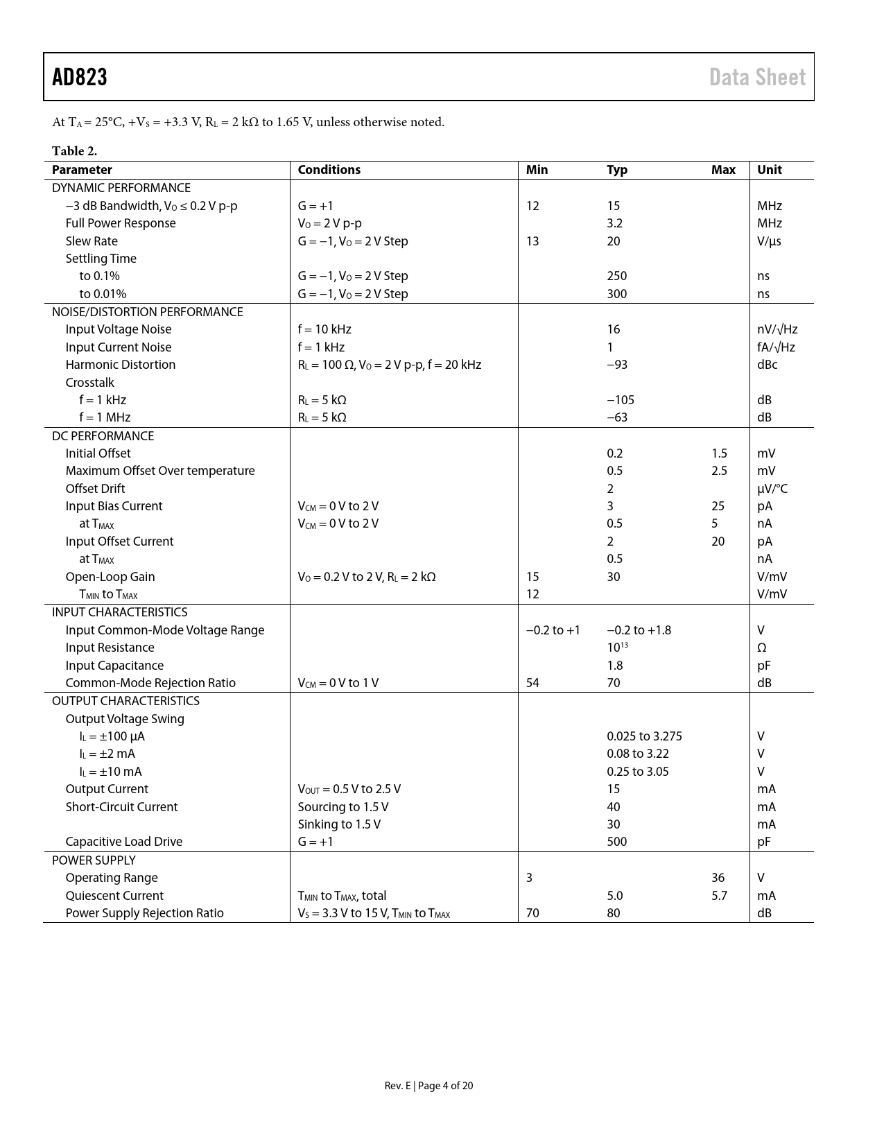 页数 / 页20 / 4 — AD823. Data Sheet. Table 2. Parameter. Conditions. Min. Typ. Max. Unit