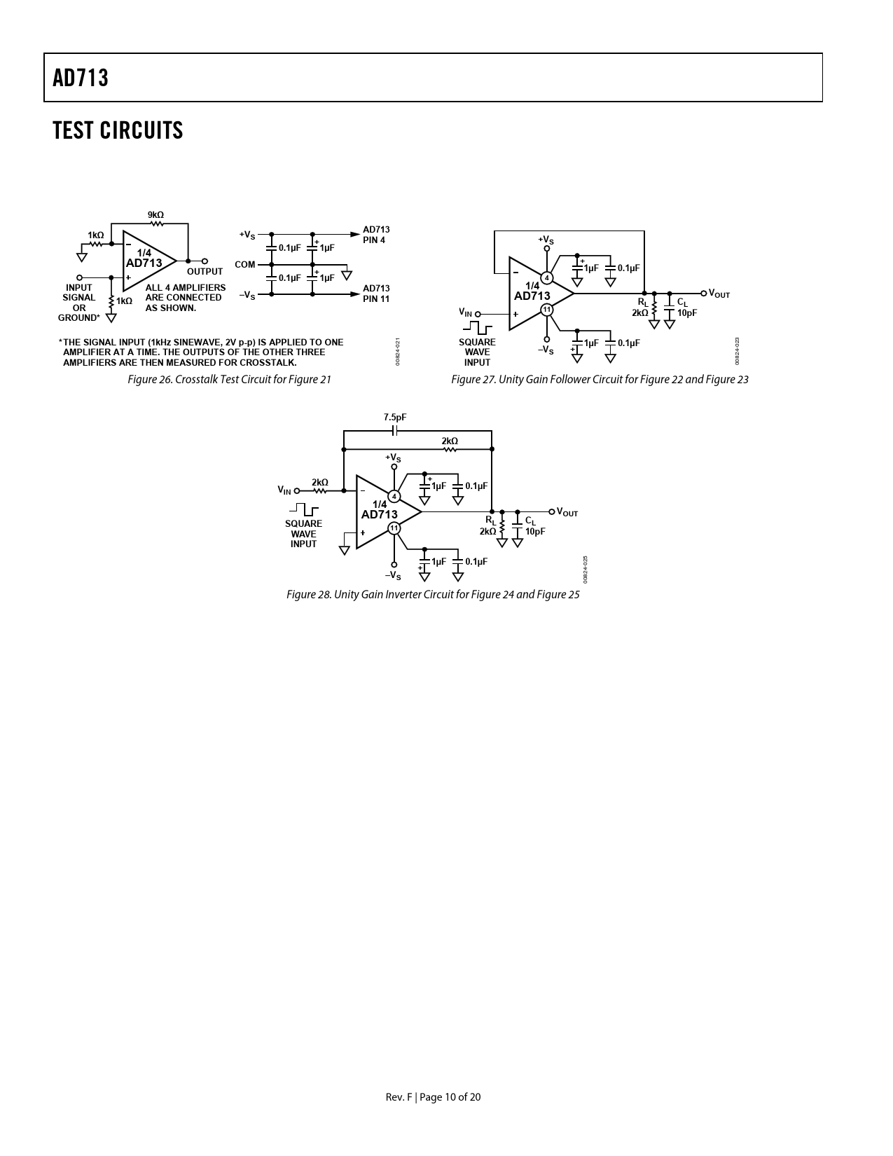 页数 / 页20 / 10 — AD713. TEST CIRCUITS. 9kΩ. 1kΩ. +VS. PIN 4. 0.1µF. 1µF. 1/4. COM. OUTPUT. …
