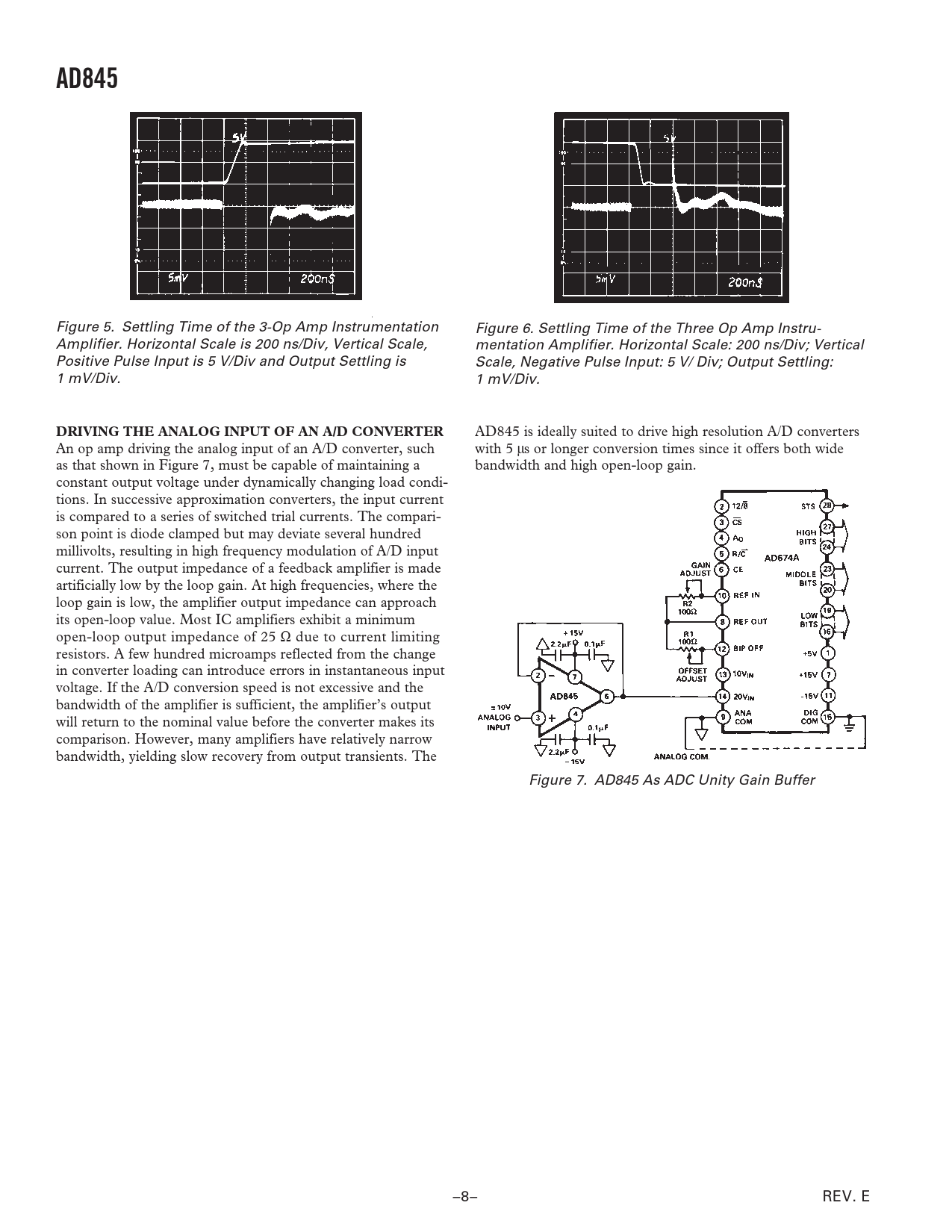 AD845 Figure 5. Settling Time of the 3-Op Amp Instrumentation Figure 6. Settling Time of the Three Op Amp Instru- Amplifier. Horizontal Scale is 200 ns/Div, Vertical Scale, mentation Amplifier. Horizontal Scale: 200 ns/Div; Vertical Positive Pulse Input is 5 V/Div and Output Settling is Scale, Negative Pulse Input: 5 V/ Div; Output Settling: 1 mV/Div. 1 mV/Div. DRIVING THE ANALOG INPUT OF AN A/D CONVERTER AD845 is ideally suited to drive high resolution A/D converters An op amp driving the analog input of an A/D converter, such with 5 ms or longer conversion times since it offers both wide as that shown in Figure 7, must be capable of maintaining a bandwidth and high open-loop gain. constant output voltage under dynamically changing load condi- tions. In successive approximation converters, the input current is compared to a series of switched trial currents. The compari- son point is diode clamped but may deviate several hundred millivolts, resulting in high frequency modulation of A/D input current. The output impedance of a feedback amplifier is made artificially low by the loop gain. At high frequencies, where the loop gain is low, the amplifier output impedance can approach its open-loop value. Most IC amplifiers exhibit a minimum open-loop output impedance of 25 W due to current limiting resistors. A few hundred microamps reflected from the change in converter loading can introduce errors in instantaneous input voltage. If the A/D conversion speed is not excessive and the bandwidth of the amplifier is sufficient, the amplifier’s output will return to the nominal value before the converter makes its comparison. However, many amplifiers have relatively narrow bandwidth, yielding slow recovery from output transients. The Figure 7. AD845 As ADC Unity Gain Buffer –8– REV. E Document Outline FEATURES AC PERFORMANCE: DC PERFORMANCE: CONNECTION DIAGRAMS GENERAL DESCRIPTION PRODUCT HIGHLIGHTS SPECIFICATIONS ABSOLUTE MAXIMUM RATINGS METALIZATION PHOTOGRAPH ORDERING GUIDE Typical Performance Characteristics MEASURING AD845 SETTLING TIME A HIGH SPEED INSTRUMENTATION AMP DRIVING THE ANALOG INPUT OF AN A/D CONVERTER OUTLINE DIMENSIONS Revision History