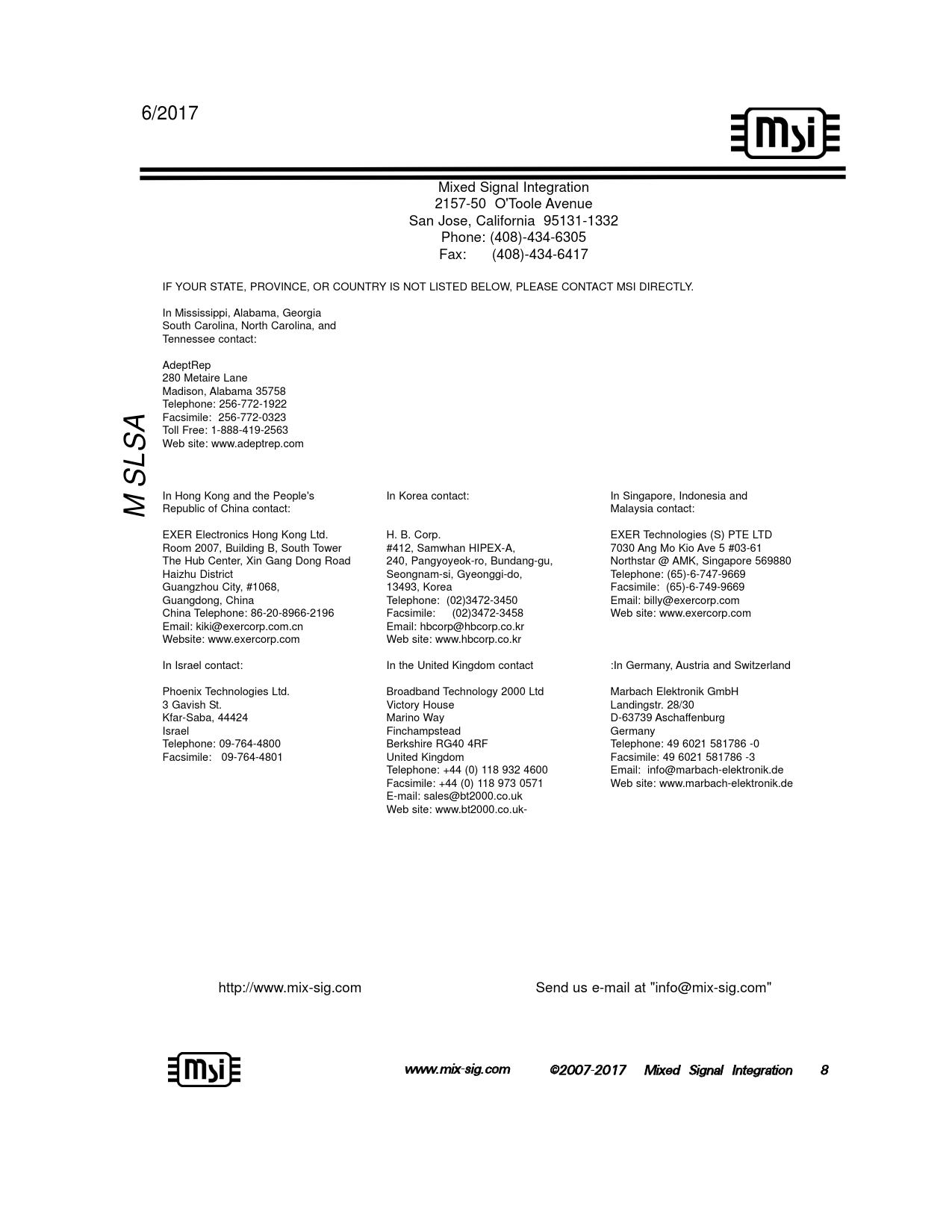 6/2017 Mixed Signal Integration 2157-50 O'Toole Avenue San Jose, California 95131-1332 Phone: (408)-434-6305 Fax: (408)-434-6417 IF YOUR STATE, PROVINCE, OR COUNTRY IS NOT LISTED BELOW, PLEASE CONTACT MSI DIRECTLY. In Mississippi, Alabama, Georgia South Carolina, North Carolina, and Tennessee contact: AdeptRep 280 Metaire Lane Madison, Alabama 35758 Telephone: 256-772-1922 Facsimile: 256-772-0323 Toll Free: 1-888-419-2563 Web site: www.adeptrep.com In Hong Kong and the People's In Korea contact: In Singapore, Indonesia and Republic of China contact: Malaysia contact: