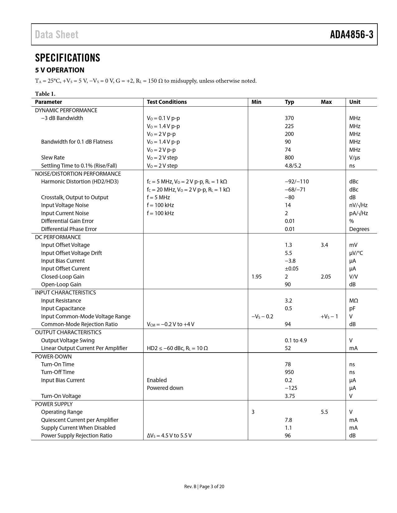 Data Sheet. ADA4856-3. SPECIFICATIONS 5 V OPERATION. Table 1. Parameter. Test Conditions. Min. Typ. Max. Unit