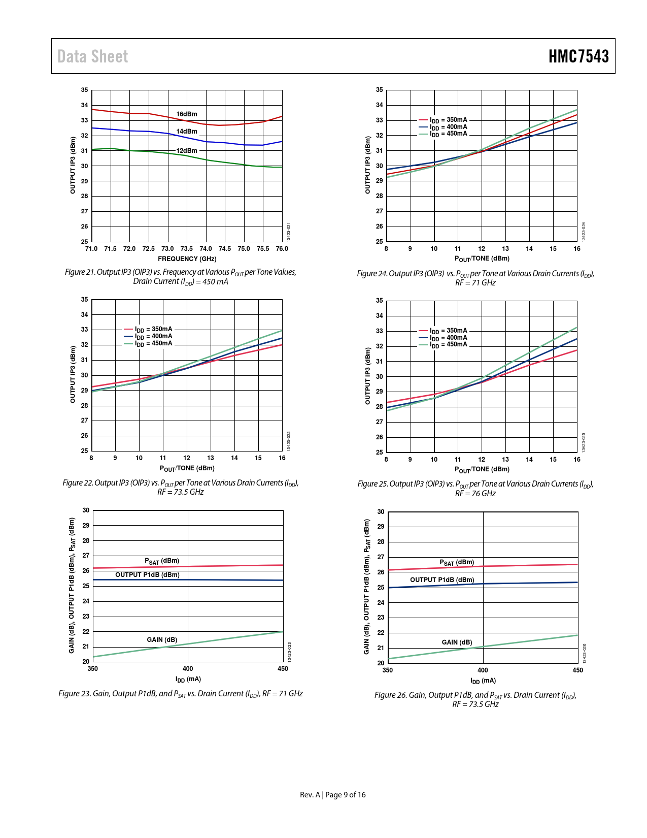 Data SheetHMC75433535343416dBm3333IDD = 350mAIDD = 400mA14dBm3232IDD = 450mABm)Bm)d3112dBmd313 (3 (PPI30I30UTUTP29P29UTUTOO2828272726 021 26 024 13423- 25 13423- 2571.071.572.072.573.073.574.074.575.075.576.08910111213141516FREQUENCY (GHz)POUT/TONE (dBm) Figure 21. Output IP3 (OIP3) vs. Frequency at Various POUT per Tone Values, Figure 24. Output IP3 (OIP3) vs. POUT per Tone at Various Drain Currents (IDD), Drain Current (IDD) = 450 mA RF = 71 GHz 3535343433IDD = 350mA33IDD = 350mAIDD = 400mAIDD = 400mA32IDD = 450mA32IDD = 450mABm) d31Bm) d313 ( P3 (I30P I30UT PUT29P29UTUTO28O28272726 022 26 025 13423- 25 13423- 2589101112131415168910111213141516POUT/TONE (dBm)POUT/TONE (dBm) Figure 22. Output IP3 (OIP3) vs. POUT per Tone at Various Drain Currents (IDD), Figure 25. Output IP3 (OIP3) vs. POUT per Tone at Various Drain Currents (IDD), RF = 73.5 GHz RF = 76 GHz 3030Bm)2929dBm)(dT(A28T28SA S), P27), P27mPSAT (dBm)mPSAT (dBm)dB (26dBOUTPUT P1dB (dBm)(26dBOUTPUT P1dB (dBm)1dB25125T PT PU24U24TPTP2323), OU), OUdB22(dB22(GAIN (dB)ININGAIN (dB)21 023 21GA 026 GA 13423- 20 13423- 20350400450350400450IDD (mA)IDD (mA) Figure 23. Gain, Output P1dB, and PSAT vs. Drain Current (IDD), RF = 71 GHz Figure 26. Gain, Output P1dB, and PSAT vs. Drain Current (IDD), RF = 73.5 GHz Rev. A | Page 9 of 16 Document Outline FEATURES APPLICATIONS GENERAL DESCRIPTION FUNCTIONAL BLOCK DIAGRAM TABLE OF CONTENTS REVISION HISTORY SPECIFICATIONS ABSOLUTE MAXIMUM RATINGS THERMAL RESISTANCE ESD CAUTION PIN CONFIGURATION AND FUNCTION DESCRIPTIONS INTERFACE SCHEMATICS TYPICAL PERFORMANCE CHARACTERISTICS THEORY OF OPERATION TYPICAL APPLICATION CIRCUIT ASSEMBLY DIAGRAM MOUNTING AND BONDING TECHNIQUES FOR MILLIMETERWAVE GaAs MMICS HANDLING PRECAUTIONS Storage Cleanliness Static Sensitivity Transients General Handling MOUNTING Eutectic Die Attach Epoxy Die Attach WIRE BONDING OUTLINE DIMENSIONS ORDERING GUIDE