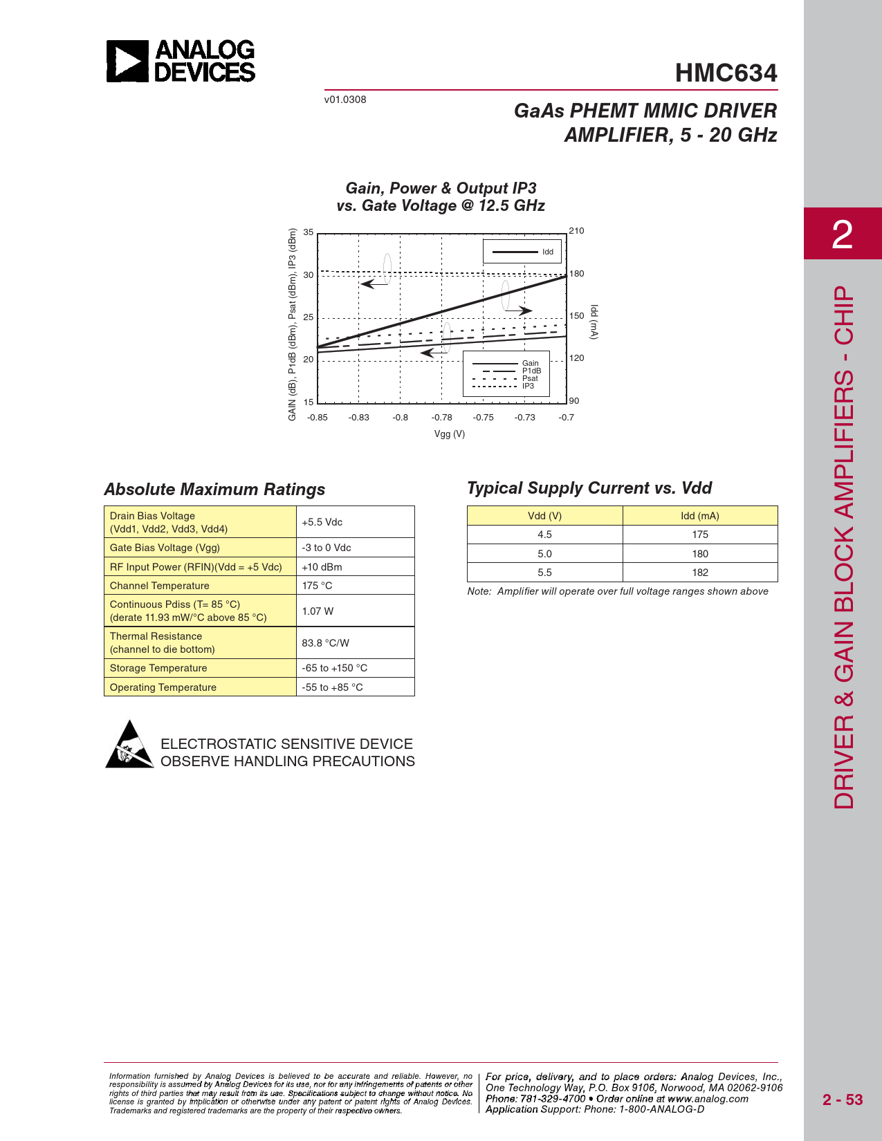 M Drain Bias Voltage Vdd (V) Idd (mA) +5.5 Vdc (Vdd1, Vdd2, Vdd3, Vdd4) 4.5 175 K A Gate Bias Voltage (Vgg) -3 to 0 Vdc 5.0 180 RF Input Power (RFIN)(Vdd = +5 Vdc) +10 dBm 5.5 182 OC Channel Temperature 175 °C Note: Amplifi er will operate over full voltage ranges shown above Continuous Pdiss (T= 85 °C) 1.07 W (derate 11.93 mW/°C above 85 °C) BL Thermal Resistance 83.8 °C/W IN (channel to die bottom) A Storage Temperature -65 to +150 °C Operating Temperature -55 to +85 °C & G R ELECTROSTATIC SENSITIVE DEVICE E OBSERVE HANDLING PRECAUTIONS IV R D Information furnis F heod r pri by An ce, de alog Devi lcievs eir s y b , a eliev nd to pla ed to be accu ce o rate anrder d relia sbl, pl e. H ease co owever, no For price, delivery, and to place orders: Analog Devices, Inc., responsibility is assumed by Analog Devices for its use, nor for any infringements of patents or other ntact Hittite Microwave Corporation: One Technology Way, P.O. Box 9106, Norwood, MA 02062-9106 20 Alpha Road, Chelmsford, MA 01824 Phone: 978 rights of third parties that may result from its use. Specifications subject to change without notice. No Pho - n25 e 0 : 7 - 81 3 - 3 32 4 9-3 F 470 ax: 978 0 • Orde - r o 25 nlin 0- e a 3 t 373 license is granted by implication or otherwise under any patent or patent rights of Analog Devices. www.analog.com