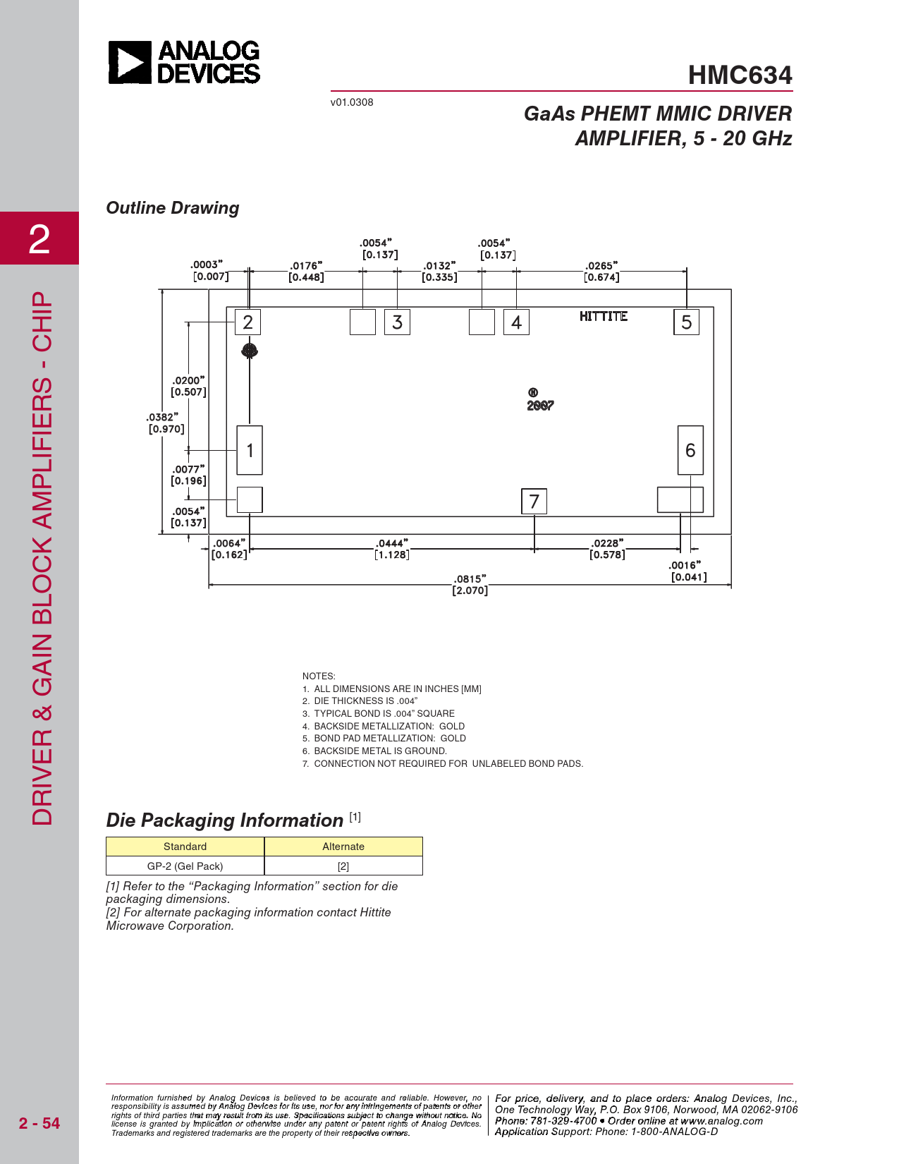 HMC634 v01.0308 GaAs PHEMT MMIC DRIVERAMPLIFIER, 5 - 20 GHzOutline Drawing 2 IP H - C S R IE IF L P M K A OC BL IN A NOTES: 1. ALL DIMENSIONS ARE IN INCHES [MM] 2. DIE THICKNESS IS .004” & G 3. TYPICAL BOND IS .004” SQUARE 4. BACKSIDE METALLIZATION: GOLD R 5. BOND PAD METALLIZATION: GOLD E 6. BACKSIDE METAL IS GROUND. 7. CONNECTION NOT REQUIRED FOR UNLABELED BOND PADS. IV R D Die Packaging Information [1] Standard Alternate GP-2 (Gel Pack) [2] [1] Refer to the “Packaging Information” section for die packaging dimensions. [2] For alternate packaging information contact Hittite Microwave Corporation. Information furnis F he o d r pri by An ce, de alog Devic leiv s ies ry be , a lievend to pla d to be accurce o ate an rd der relia s bl , pl e. Ho ease co wever, no For price, delivery, and to place orders: Analog Devices, Inc., responsibility is assumed by Analog Devices for its use, nor for any infringements of patents or other ntact Hittite Microwave Corporation: One Technology Way, P.O. Box 9106, Norwood, MA 02062-9106 rights of third parties that may result from its use. Specifications subject to change without notice. No 2 - 54 20 Alpha Road, Chelmsford, MA 01824 Phone: 978 Pho - n 25 e: 7 0- 81 33 2 4 9- 3 F 470 ax: 978 0 • Order o - n25 lin 0- e a 3 t 373 license is granted by implication or otherwise under any patent or patent rights of Analog Devices. www.analog.com Order On- Trademarks and registered trademarks are the property of their respective owners. line at www.hit A tpite.co plicatio m n Support: Phone: 1-800-ANALOG-D