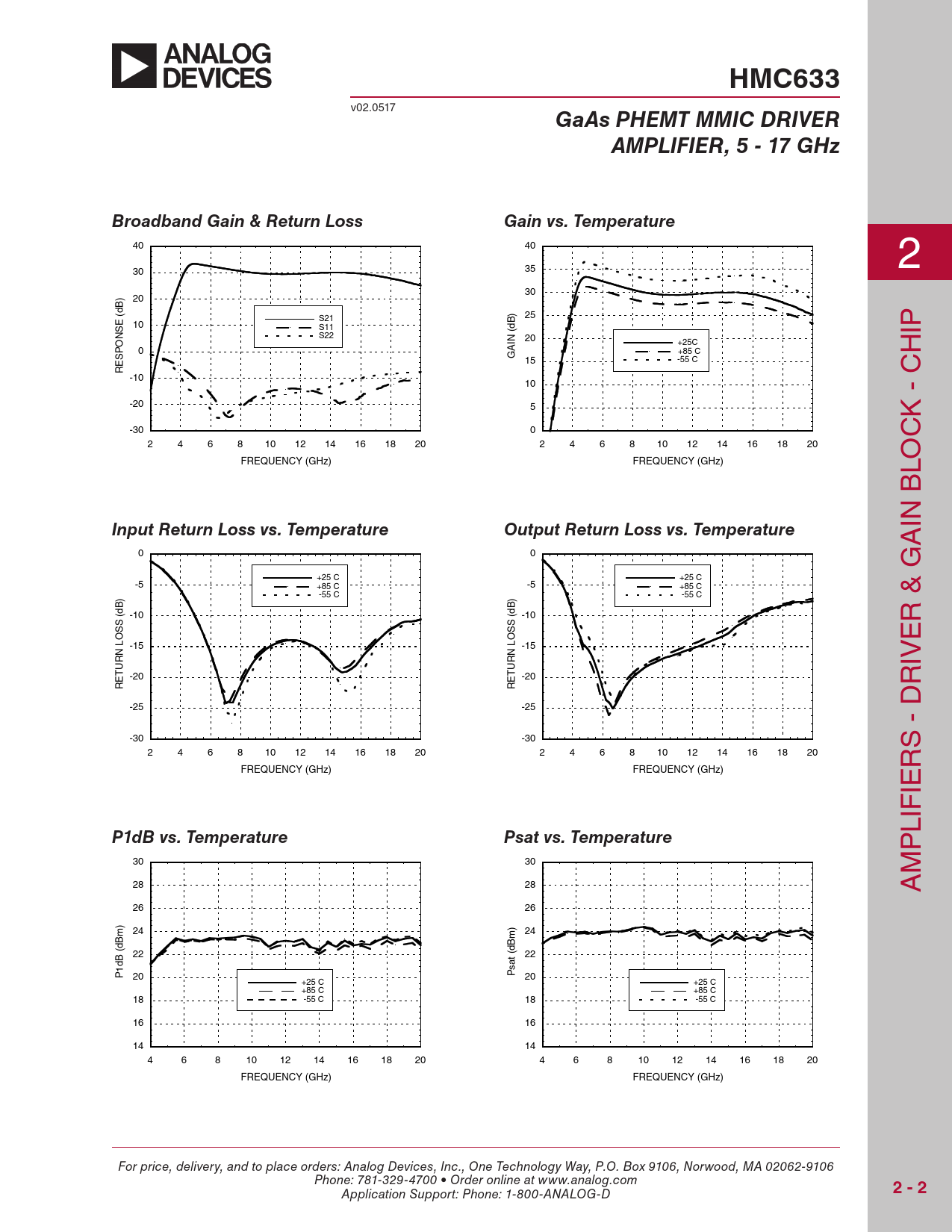 P 30 30 M 28 28 A 26 26 24 24 (dBm) 22 (dBm) 22 P1dB 20 Psat 20 +25 C +25 C +85 C +85 C 18 -55 C 18 -55 C 16 16 14 14 4 6 8 10 12 14 16 18 20 4 6 8 10 12 14 16 18 20 FREQUENCY (GHz) FREQUENCY (GHz) For price, delivery, and to place orders: Analog Devices, Inc., One Technology Way, P.O. Box 9106, Norwood, MA 02062-9106 Phone: 781-329-4700 • Order online at www.analog.com