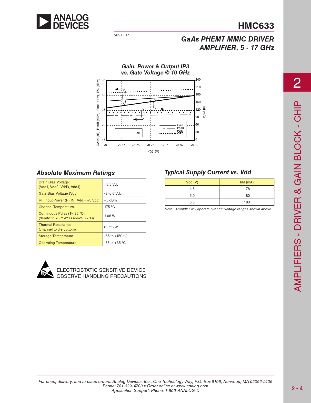 A Drain Bias Voltage Vdd (V) Idd (mA) +5.5 Vdc (Vdd1, Vdd2, Vdd3, Vdd4) 4.5 178 Gate Bias Voltage (Vgg) -3 to 0 Vdc 5.0 180 RF Input Power (RFIN)(Vdd = +5 Vdc) +5 dBm 5.5 183 R & G Channel Temperature 175 °C Note: Amplifier will operate over full voltage ranges shown above E Continuous Pdiss (T= 85 °C) 1.06 W (derate 11.76 mW/°C above 85 °C) IV Thermal Resistance R 85 °C/W (channel to die bottom) Storage Temperature -65 to +150 °C Operating Temperature -55 to +85 °C S - D R IE ELECTROSTATIC SENSITIVE DEVICE LIF OBSERVE HANDLING PRECAUTIONS P M A For price, delivery, and to place orders: Analog Devices, Inc., One Technology Way, P.O. Box 9106, Norwood, MA 02062-9106 Phone: 781-329-4700 • Order online at www.analog.com