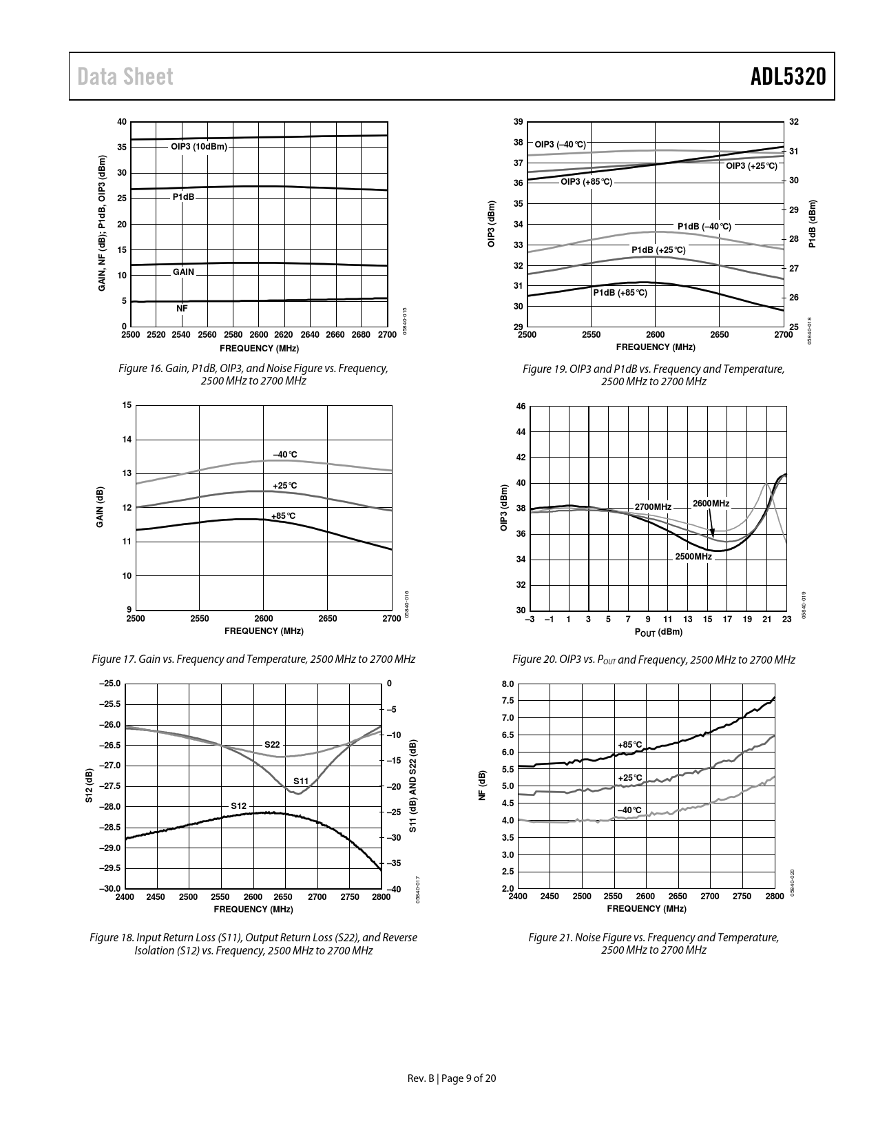 Figure 16. Gain, P1dB, OIP3, and Noise Figure vs. Frequency, Figure 19. OIP3 and P1dB vs. Frequency and Temperature, 2500 MHz to 2700 MHz 2500 MHz to 2700 MHz