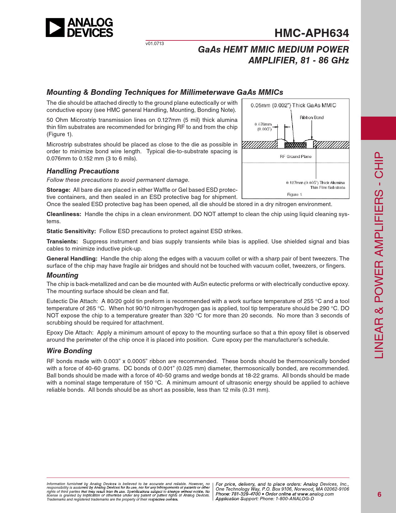 LIN RF bonds made with 0.003” x 0.0005” ribbon are recommended. These bonds should be thermosonical y bonded with a force of 40-60 grams. DC bonds of 0.001” (0.025 mm) diameter, thermosonical y bonded, are recommended. Ball bonds should be made with a force of 40-50 grams and wedge bonds at 18-22 grams. All bonds should be made with a nominal stage temperature of 150 °C. A minimum amount of ultrasonic energy should be applied to achieve reliable bonds. All bonds should be as short as possible, less than 12 mils (0.31 mm). Information furnish F e o d r p by A rnic alo e g , d Devi ecleis vie s rby eli, a eve nd t d to b o p e a l cc a ur c at e o e an r d d releiars ble , p . Ho le we a ve sr, e c no For price, delivery, and to place orders: Analog Devices, Inc., responsibility is assumed by Analog Devices for its use, nor for any infringements of patents or other ontact Hittite Microwave Corporation: One Technology Way, P.O. Box 9106, Norwood, MA 02062-9106 2 Elizabeth Drive, Chelmsford, MA 01824 Phon rights of third parties that may result from its use. Specifications subject to change without notice. No e: 9 Ph 7 o 8 ne -2 : 7 50 81- - 3 3 2 3 9- 4 4 3 F 70 a 0 • Ox: 9 rde 7 r o 8 nli-2 n 5 e a0 t -33 ww 7 w. 3 license is granted by implication or otherwise under any patent or patent rights of Analog Devices. analog.com