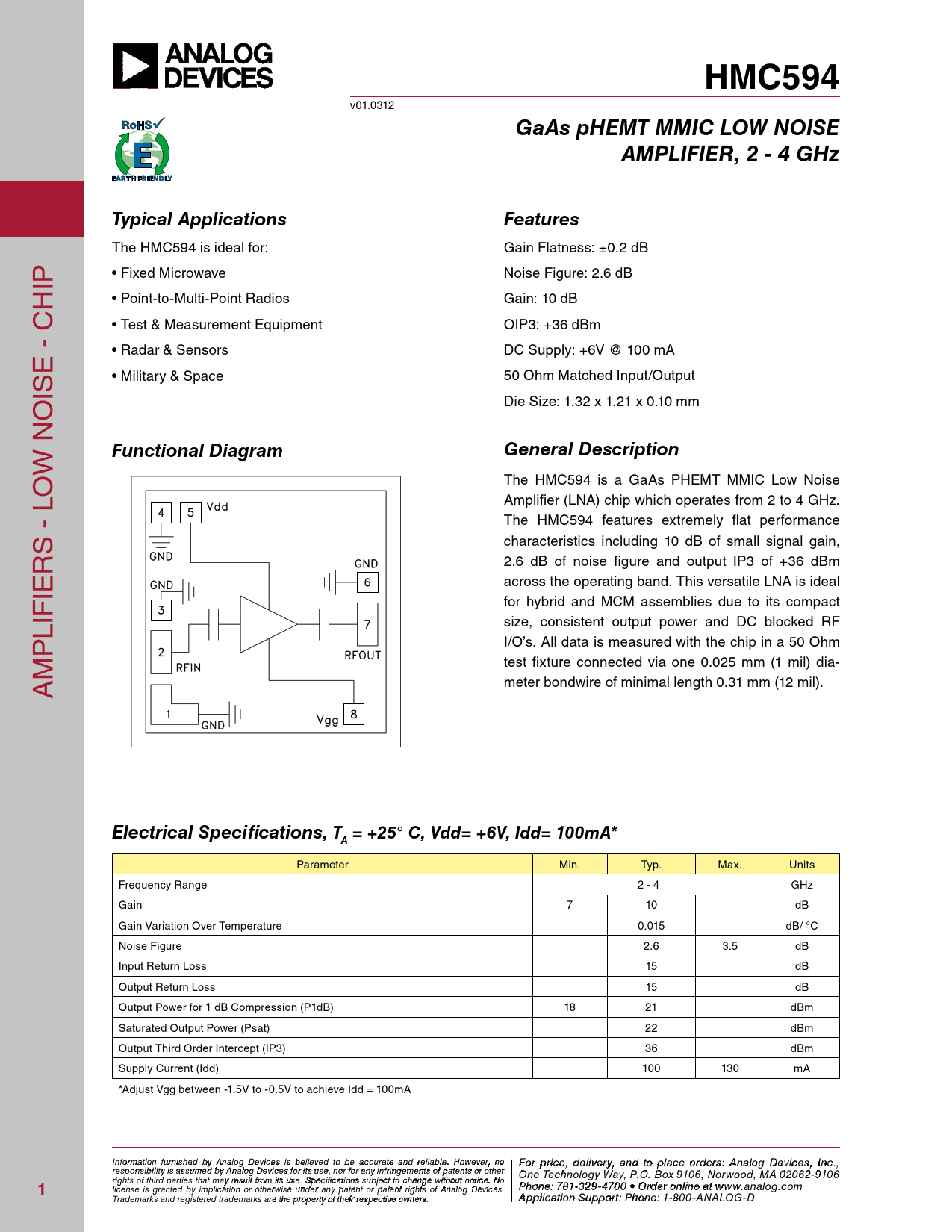 HMC594. GaAs pHEMT MMIC LOW NOISE. AMPLIFIER, 2 - 4 GHz. Typical Applications. Features. Functional Diagram. General Description