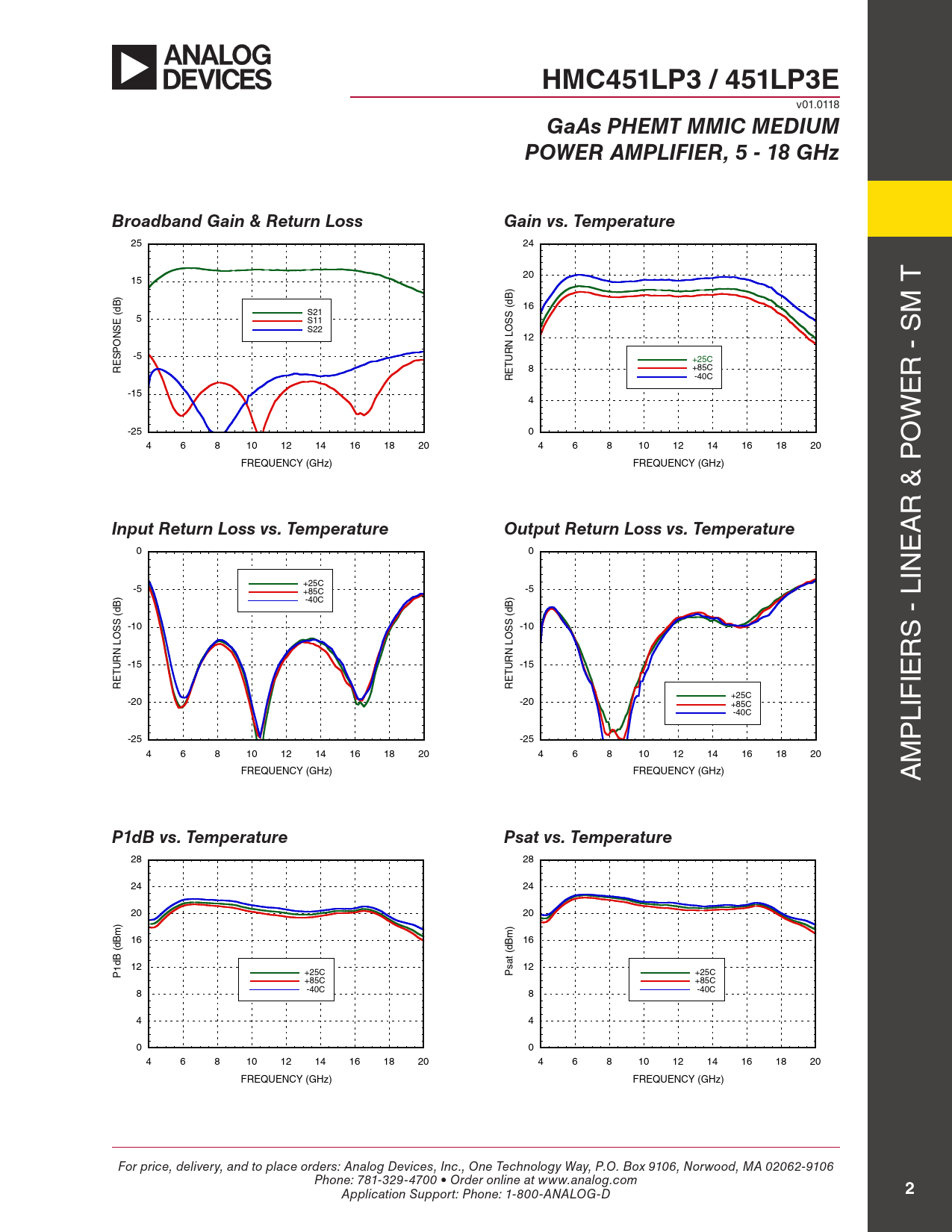 28 28 24 24 20 20 ) m m 16 16 (dB (dB at 1dB 12 s 12 +25C P +25C P +85C +85C 8 -40C 8 -40C 4 4 0 0 4 6 8 10 12 14 16 18 20 4 6 8 10 12 14 16 18 20 FREQUENCY (GHz) FREQUENCY (GHz) For price, delivery, and to place orders: Analog Devices, Inc., One Technology Way, P.O. Box 9106, Norwood, MA 02062-9106 Phone: 781-329-4700 • Order online at www.analog.com Application Support: Phone: 1-800-ANALOG-D