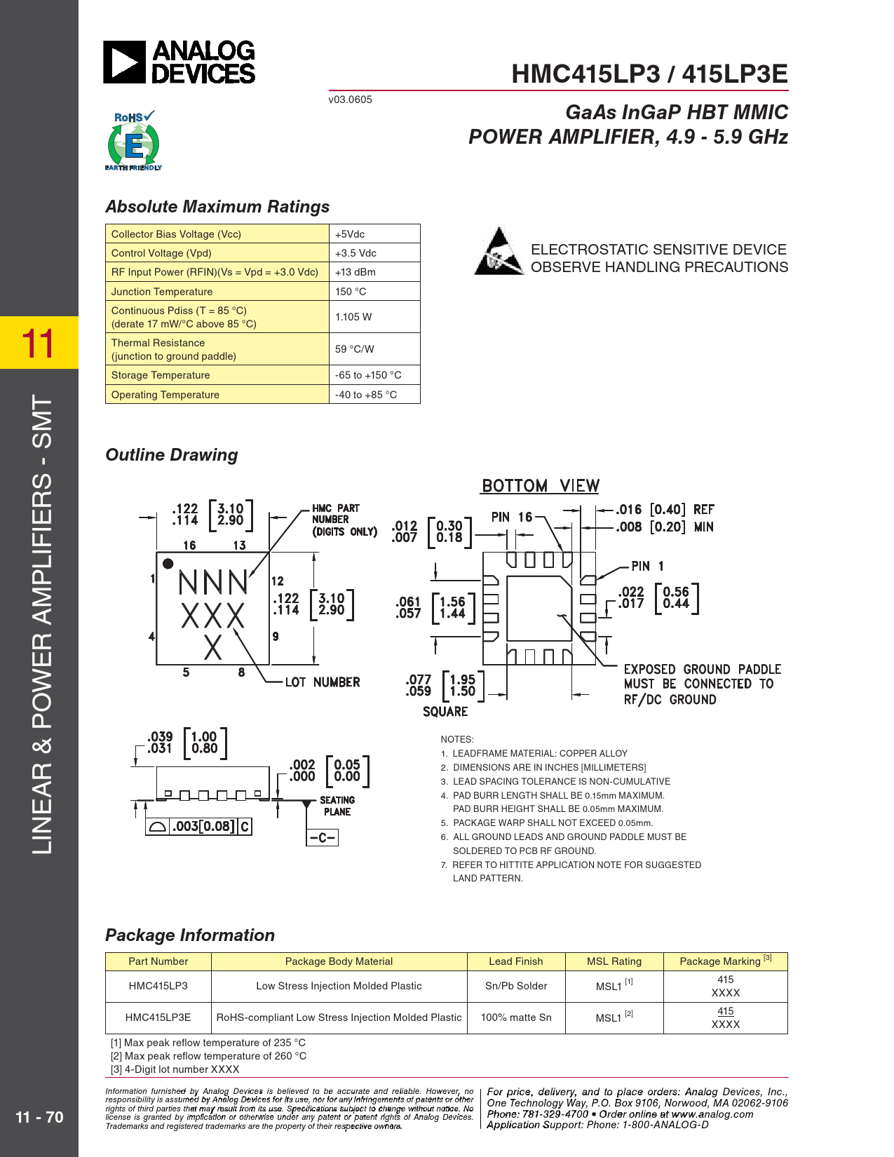 HMC415LP3 / 415LP3E. GaAs InGaP HBT MMIC. POWER AMPLIFIER, 4.9 - 5.9 GHz. Absolute Maximum Ratings. Outline Drawing