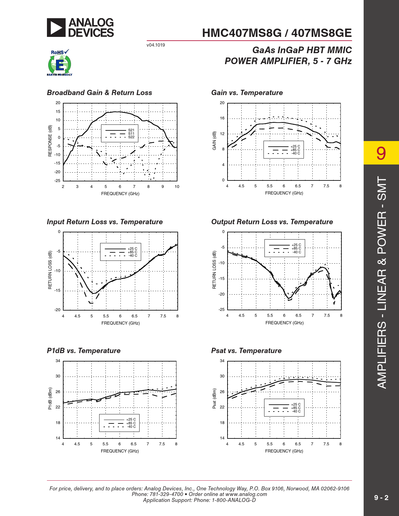 HMC407MS8G / 407MS8GE. GaAs InGaP HBT MMIC. POWER AMPLIFIER, 5 - 7 GHz. Broadband Gain & Return Loss. Gain vs. Temperature