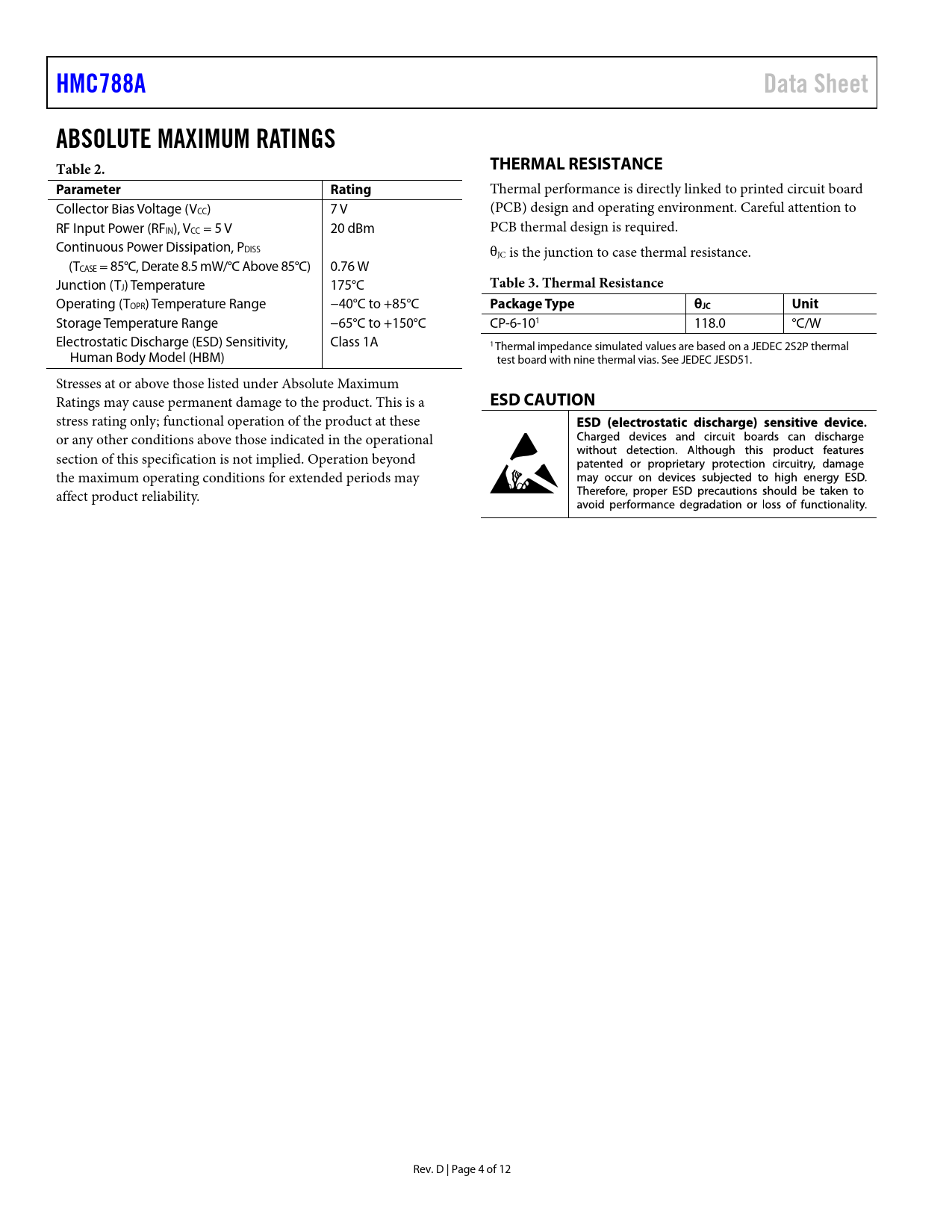 页数 / 页12 / 4 — HMC788A. Data Sheet. ABSOLUTE MAXIMUM RATINGS Table 2. THERMAL …