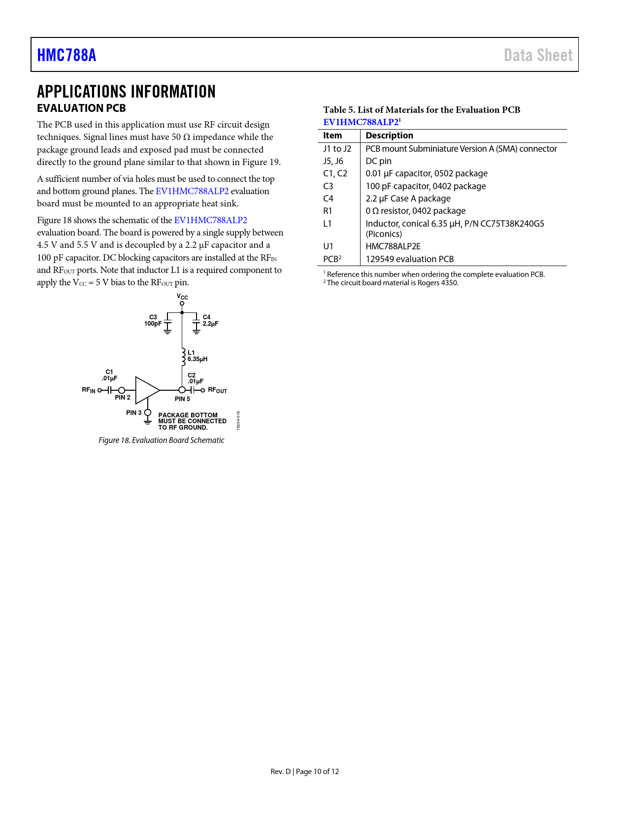 link to page 11 link to page 10 HMC788AData SheetAPPLICATIONS INFORMATIONEVALUATION PCBTable 5. List of Materials for the Evaluation PCB The PCB used in this application must use RF circuit design EV1HMC788ALP21 techniques. Signal lines must have 50 Ω impedance while the ItemDescription package ground leads and exposed pad must be connected J1 to J2 PCB mount Subminiature Version A (SMA) connector directly to the ground plane similar to that shown in Figure 19. J5, J6 DC pin A sufficient number of via holes must be used to connect the top C1, C2 0.01 μF capacitor, 0502 package and bottom ground planes. The EV1HMC788ALP2 evaluation C3 100 pF capacitor, 0402 package board must be mounted to an appropriate heat sink. C4 2.2 μF Case A package R1 0 Ω resistor, 0402 package Figure 18 shows the schematic of the EV1HMC788ALP2 L1 Inductor, conical 6.35 μH, P/N CC75T38K240G5 evaluation board. The board is powered by a single supply between (Piconics) 4.5 V and 5.5 V and is decoupled by a 2.2 µF capacitor and a U1 HMC788ALP2E 100 pF capacitor. DC blocking capacitors are instal ed at the RFIN PCB2 129549 evaluation PCB and RFOUT ports. Note that inductor L1 is a required component to 1 Reference this number when ordering the complete evaluation PCB. apply the VCC = 5 V bias to the RFOUT pin. 2 The circuit board material is Rogers 4350. VCCC3C4100pF2.2µFL1 6.35µHC1C2.01µF.01µFRFINRFOUTPIN 2PIN 5PIN 3PACKAGE BOTTOM 018 MUST BE CONNECTED TO RF GROUND. 16204- Figure 18. Evaluation Board Schematic Rev. D | Page 10 of 12 Document Outline FEATURES APPLICATIONS FUNCTIONAL BLOCK DIAGRAM GENERAL DESCRIPTION REVISION HISTORY SPECIFICATIONS ELECTRICAL SPECIFICATIONS ABSOLUTE MAXIMUM RATINGS THERMAL RESISTANCE ESD CAUTION PIN CONFIGURATION AND FUNCTION DESCRIPTIONS INTERFACE SCHEMATICS TYPICAL PERFORMANCE CHARACTERISTICS THEORY OF OPERATION BASIC CONNECTIONS APPLICATIONS INFORMATION EVALUATION PCB OUTLINE DIMENSIONS ORDERING GUIDE
