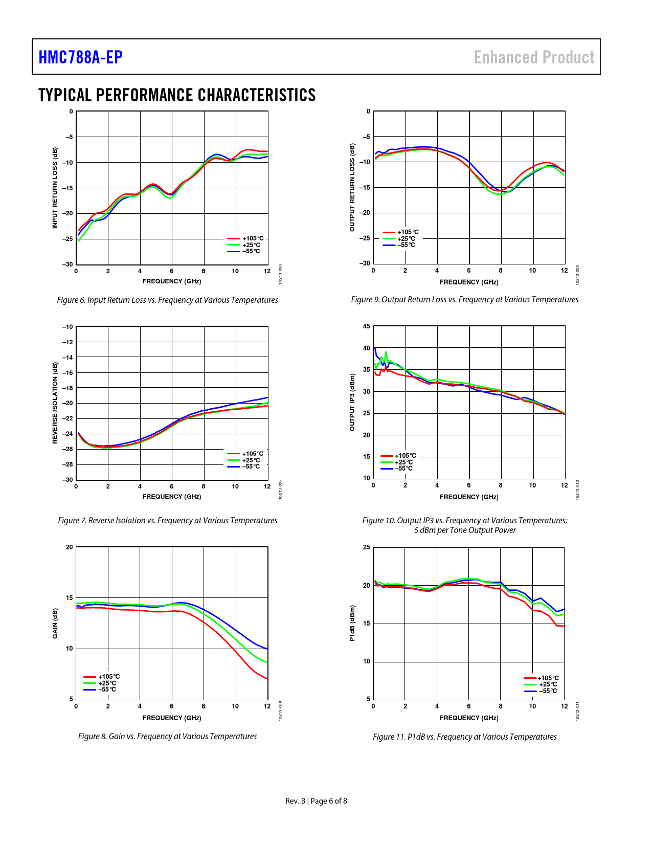 HMC788A-EPEnhanced ProductTYPICAL PERFORMANCE CHARACTERISTICS00–5–5B)B)dd(( –10SS–10SSOO–15URN L –15URN LTTRERE–20UT –20UTPINPUT O+105°C–25+105°C–25+25°C+25°C–55°C–55°C–30–30024681012 006 024681012 009 FREQUENCY (GHz) 16213- FREQUENCY (GHz) 16213- Figure 6. Input Return Loss vs. Frequency at Various Temperatures Figure 9. Output Return Loss vs. Frequency at Various Temperatures –1045–1240–14) B–1635(d N IOBm)–18TdA303 (LP–20ISOUT25–22PSE IUT O–24EVER20R–26+105°C15+105°C+25°C–28+25°C–55°C–55°C–3010024681012 007 024681012 013 FREQUENCY (GHz) 16213- FREQUENCY (GHz) 16213- Figure 7. Reverse Isolation vs. Frequency at Various Temperatures Figure 10. Output IP3 vs. Frequency at Various Temperatures; 5 dBm per Tone Output Power 20252015B) dBm) dN (15B (AI G1d P1010+105°C+105°C+25°C+25°C–55°C–55°C55 1 024681012 1 008 024681012 0 FREQUENCY (GHz) 16213- FREQUENCY (GHz) 16213- Figure 8. Gain vs. Frequency at Various Temperatures Figure 11. P1dB vs. Frequency at Various Temperatures Rev. B | Page 6 of 8 Document Outline Features Enhanced Product Features Applications Functional Block Diagram General Description Revision History Specifications Electrical Specifications Absolute Maximum Ratings Thermal Resistance Power Derating Curves ESD Caution Pin Configuration and Function Descriptions Interface Schematics Typical Performance Characteristics Outline Dimensions Ordering Guide