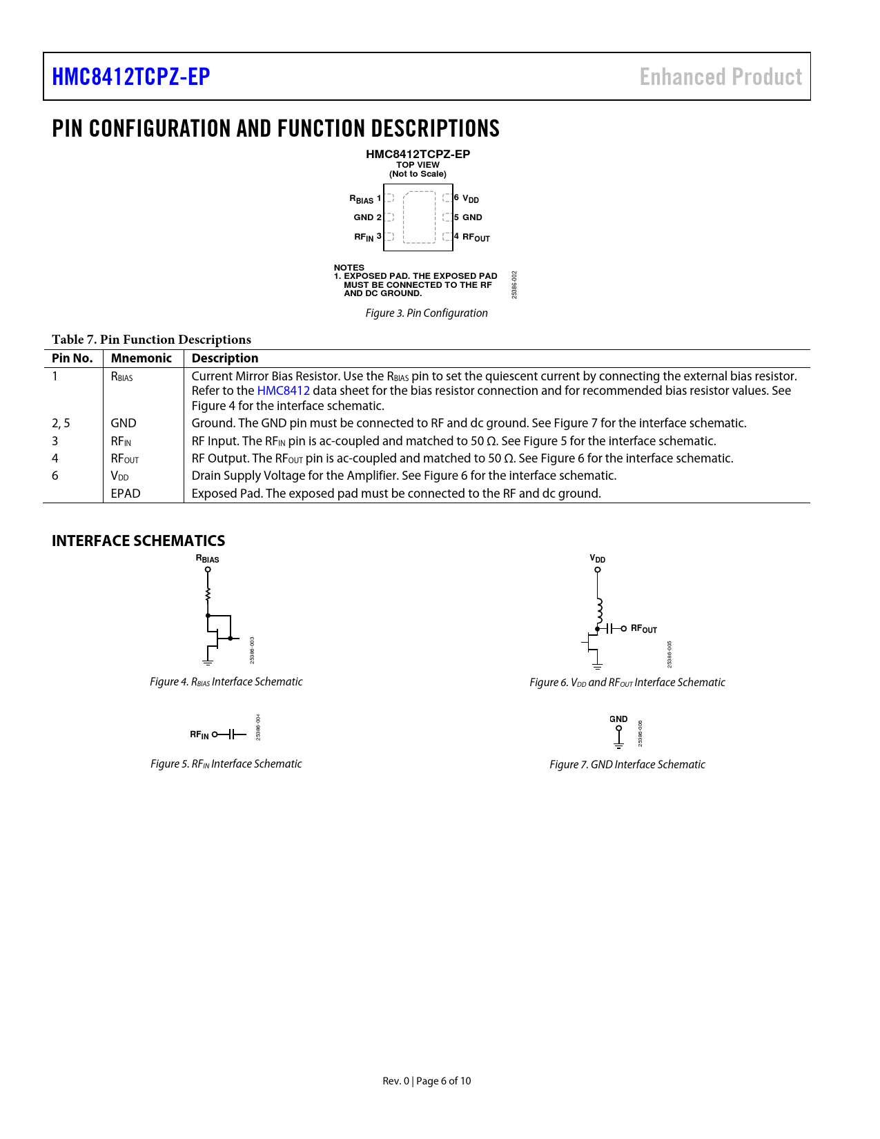 1 RBIAS Current Mirror Bias Resistor. Use the RBIAS pin to set the quiescent current by connecting the external bias resistor. Refer to the HMC8412 data sheet for the bias resistor connection and for recommended bias resistor values. See Figure 4 for the interface schematic. 2, 5 GND Ground. The GND pin must be connected to RF and dc ground. See Figure 7 for the interface schematic. 3 RFIN RF Input. The RFIN pin is ac-coupled and matched to 50 Ω. See Figure 5 for the interface schematic. 4 RFOUT RF Output. The RFOUT pin is ac-coupled and matched to 50 Ω. See Figure 6 for the interface schematic. 6 VDD Drain Supply Voltage for the Amplifier. See Figure 6 for the interface schematic. EPAD Exposed Pad. The exposed pad must be connected to the RF and dc ground.