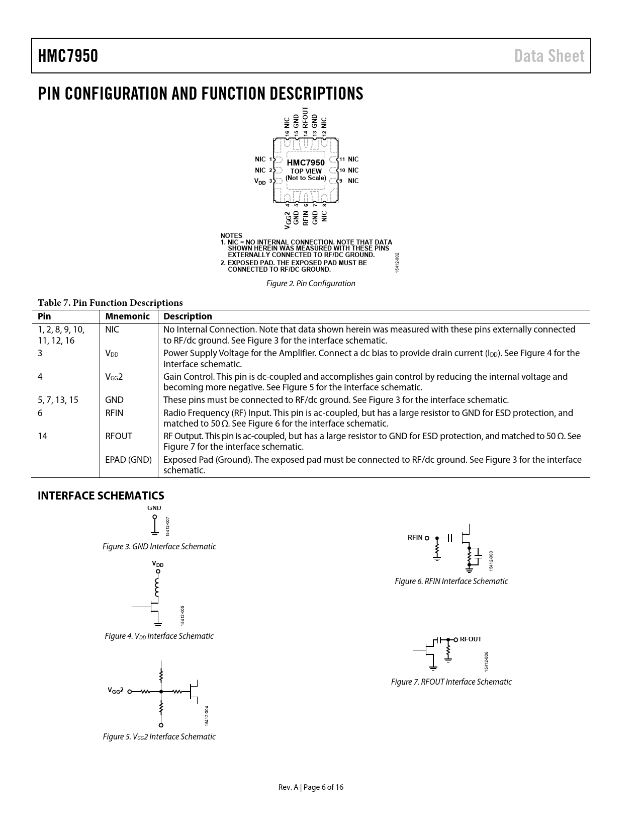link to page 6 link to page 6 link to page 6 link to page 6 link to page 6 link to page 6 link to page 6 HMC7950Data SheetPIN CONFIGURATION AND FUNCTION DESCRIPTIONST UDDCNFONCNIGRGNI1615141312NIC 111 NICHMC7950NIC 2TOP VIEW10 NICV3(Not to Scale)DD9 NIC456782DDNNICGFINGNV GGRNOTES1. NIC = NO INTERNAL CONNECTION. NOTE THAT DATASHOWN HEREIN WAS MEASURED WITH THESE PINSEXTERNALLY CONNECTED TO RF/DC GROUND. 002 2. EXPOSED PAD. THE EXPOSED PAD MUST BECONNECTED TO RF/DC GROUND. 15412- Figure 2. Pin Configuration Table 7. Pin Function Descriptions PinMnemonicDescription 1, 2, 8, 9, 10, NIC No Internal Connection. Note that data shown herein was measured with these pins externally connected 11, 12, 16 to RF/dc ground. See Figure 3 for the interface schematic. 3 VDD Power Supply Voltage for the Amplifier. Connect a dc bias to provide drain current (IDD). See Figure 4 for the interface schematic. 4 VGG2 Gain Control. This pin is dc-coupled and accomplishes gain control by reducing the internal voltage and becoming more negative. See Figure 5 for the interface schematic. 5, 7, 13, 15 GND These pins must be connected to RF/dc ground. See Figure 3 for the interface schematic. 6 RFIN Radio Frequency (RF) Input. This pin is ac-coupled, but has a large resistor to GND for ESD protection, and matched to 50 Ω. See Figure 6 for the interface schematic. 14 RFOUT RF Output. This pin is ac-coupled, but has a large resistor to GND for ESD protection, and matched to 50 Ω. See Figure 7 for the interface schematic. EPAD (GND) Exposed Pad (Ground). The exposed pad must be connected to RF/dc ground. See Figure 3 for the interface schematic. INTERFACE SCHEMATICSGND 007 15412- RFIN Figure 3. GND Interface Schematic 003 VDD 15412- Figure 6. RFIN Interface Schematic 005 15412- Figure 4. VDD Interface Schematic RFOUT 006 15412- Figure 7. RFOUT Interface Schematic VGG2 004 15412- Figure 5. VGG2 Interface Schematic Rev. A | Page 6 of 16 Document Outline FEATURES APPLICATIONS FUNCTIONAL BLOCK DIAGRAM GENERAL DESCRIPTION REVISION HISTORY SPECIFICATIONS 2 GHz TO 5 GHz FREQUENCY RANGE 5 GHz TO 18 GHz FREQUENCY RANGE 18 GHz TO 28 GHz FREQUENCY RANGE DC SPECIFICATIONS ABSOLUTE MAXIMUM RATINGS THERMAL RESISTANCE ESD CAUTION PIN CONFIGURATION AND FUNCTION DESCRIPTIONS INTERFACE SCHEMATICS TYPICAL PERFORMANCE CHARACTERISTICS THEORY OF OPERATION APPLICATIONS INFORMATION EVALUATION BOARD EVALUATION BOARD SCHEMATIC OUTLINE DIMENSIONS ORDERING GUIDE