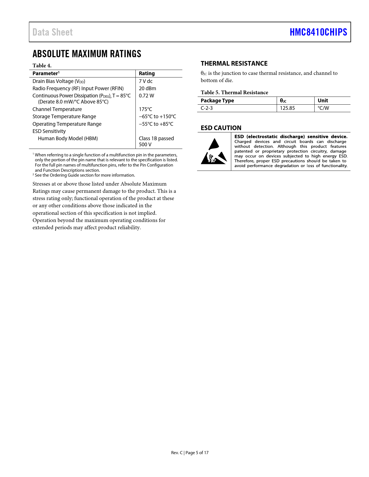 link to page 6 link to page 6 link to page 17 Data SheetHMC8410CHIPSABSOLUTE MAXIMUM RATINGS Table 4.THERMAL RESISTANCEParameter1Rating θJC is the junction to case thermal resistance, and channel to Drain Bias Voltage (VDD) 7 V dc bottom of die. Radio Frequency (RF) Input Power (RFIN) 20 dBm Continuous Power Dissipation (P Table 5. Thermal Resistance DISS), T = 85°C 0.72 W (Derate 8.0 mW/°C Above 85°C) Package TypeθJCUnit Channel Temperature 175°C C-2-3 125.85 °C/W Storage Temperature Range −65°C to +150°C Operating Temperature Range −55°C to +85°C ESD CAUTION ESD Sensitivity Human Body Model (HBM) Class 1B passed 500 V 1 When referring to a single function of a multifunction pin in the parameters, only the portion of the pin name that is relevant to the specification is listed. For the full pin names of multifunction pins, refer to the Pin Configuration and Function Descriptions section. 2 See the Ordering Guide section for more information. Stresses at or above those listed under Absolute Maximum Ratings may cause permanent damage to the product. This is a stress rating only; functional operation of the product at these or any other conditions above those indicated in the operational section of this specification is not implied. Operation beyond the maximum operating conditions for extended periods may affect product reliability. Rev. C | Page 5 of 17 Document Outline FEATURES APPLICATIONS FUNCTIONAL BLOCK DIAGRAM GENERAL DESCRIPTION TABLE OF CONTENTS REVISION HISTORY SPECIFICATIONS 0.01 GHz TO 3 GHz FREQUENCY RANGE 3 GHz TO 8 GHz FREQUENCY RANGE 8 GHz TO 10 GHz FREQUENCY RANGE ABSOLUTE MAXIMUM RATINGS THERMAL RESISTANCE ESD CAUTION PIN CONFIGURATION AND FUNCTION DESCRIPTIONS INTERFACE SCHEMATICS TYPICAL PERFORMANCE CHARACTERISTICS THEORY OF OPERATION APPLICATIONS INFORMATION RECOMMENDED BIAS SEQUENCING MOUNTING AND BONDING TECHNIQUES FOR MILLIMETERWAVE GaAs MMICS Handling Precautions APPLICATION CIRCUIT ASSEMBLY DIAGRAM OUTLINE DIMENSIONS ORDERING GUIDE