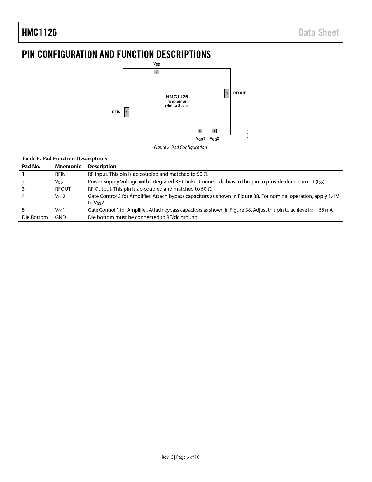 页数 / 页16 / 6 — HMC1126. Data Sheet. PIN CONFIGURATION AND FUNCTION DESCRIPTIONS. VDD. …