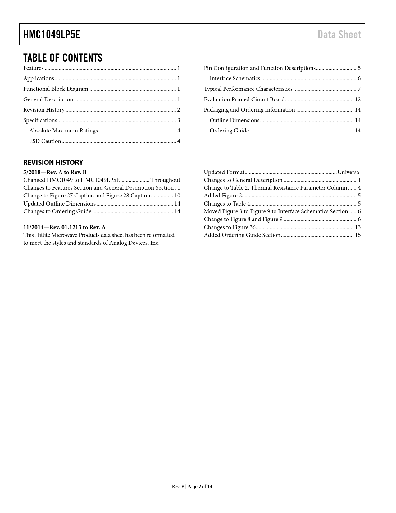 页数 / 页14 / 2 — HMC1049LP5E. Data Sheet. TABLE OF CONTENTS. REVISION HISTORY 5/2018—Rev. …