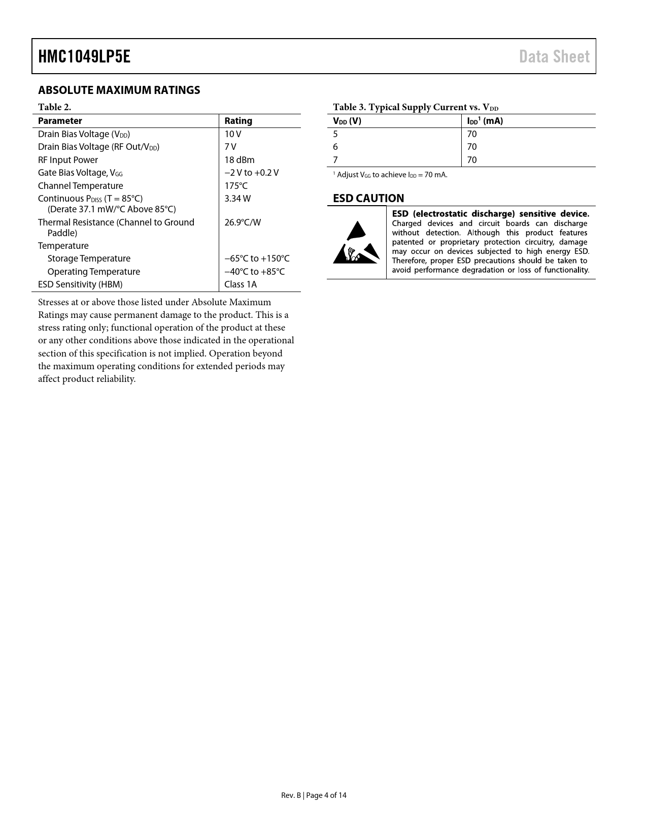 HMC1049LP5EData SheetABSOLUTE MAXIMUM RATINGSTable 2.Table 3. Typical Supply Current vs. VDDParameter RatingV1DD (V)IDD (mA) Drain Bias Voltage (VDD) 10 V 5 70 Drain Bias Voltage (RF Out/VDD) 7 V 6 70 RF Input Power 18 dBm 7 70 Gate Bias Voltage, VGG −2 V to +0.2 V 1 Adjust VGG to achieve IDD = 70 mA. Channel Temperature 175°C Continuous PDISS (T = 85°C) 3.34 W ESD CAUTION (Derate 37.1 mW/°C Above 85°C) Thermal Resistance (Channel to Ground 26.9°C/W Paddle) Temperature Storage Temperature −65°C to +150°C Operating Temperature −40°C to +85°C ESD Sensitivity (HBM) Class 1A Stresses at or above those listed under Absolute Maximum Ratings may cause permanent damage to the product. This is a stress rating only; functional operation of the product at these or any other conditions above those indicated in the operational section of this specification is not implied. Operation beyond the maximum operating conditions for extended periods may affect product reliability. Rev. B | Page 4 of 14 Document Outline Features Applications Functional Block Diagram General Description Revision History Specifications Absolute Maximum Ratings ESD Caution Pin Configuration and Function Descriptions Interface Schematics Typical Performance Characteristics Evaluation Printed Circuit Board Packaging and Ordering Information Outline Dimensions Ordering Guide