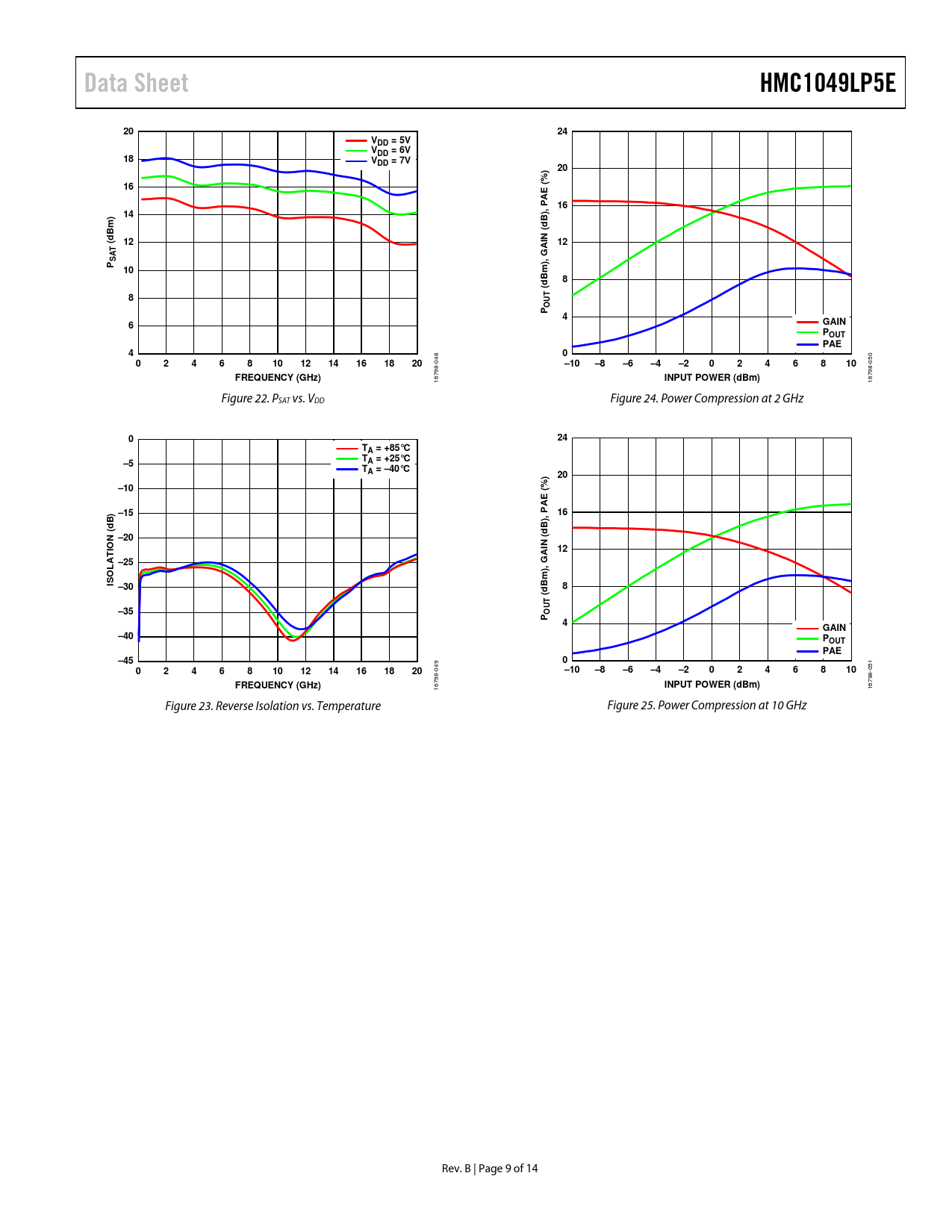 Data SheetHMC1049LP5E2024VDD = 5VVDD = 6V18VDD = 7V20%)16( AE16, P14B) dBm) dN ((1212AIAT S, GP10Bm)8d (8UT OP 46GAIN POUT PAE4002468101214161820 048 –10–8–6–4–20246810 050 FREQUENCY (GHz) 16798- INPUT POWER (dBm) 16798- Figure 22. PSAT vs. VDD Figure 24. Power Compression at 2 GHz 024TA = +85°CT–5A = +25°CTA = –40°C20–10%) ( AE) –1516, PdBB)(d–20N (12TIONAI–25, GOLA IS –30Bm)8d (UT–35OP 4GAIN–40POUT PAE–45002468101214161820 049 –10–8–6–4–20246810 051 FREQUENCY (GHz)INPUT POWER (dBm) 16798- 16798- Figure 23. Reverse Isolation vs. Temperature Figure 25. Power Compression at 10 GHz Rev. B | Page 9 of 14 Document Outline Features Applications Functional Block Diagram General Description Revision History Specifications Absolute Maximum Ratings ESD Caution Pin Configuration and Function Descriptions Interface Schematics Typical Performance Characteristics Evaluation Printed Circuit Board Packaging and Ordering Information Outline Dimensions Ordering Guide