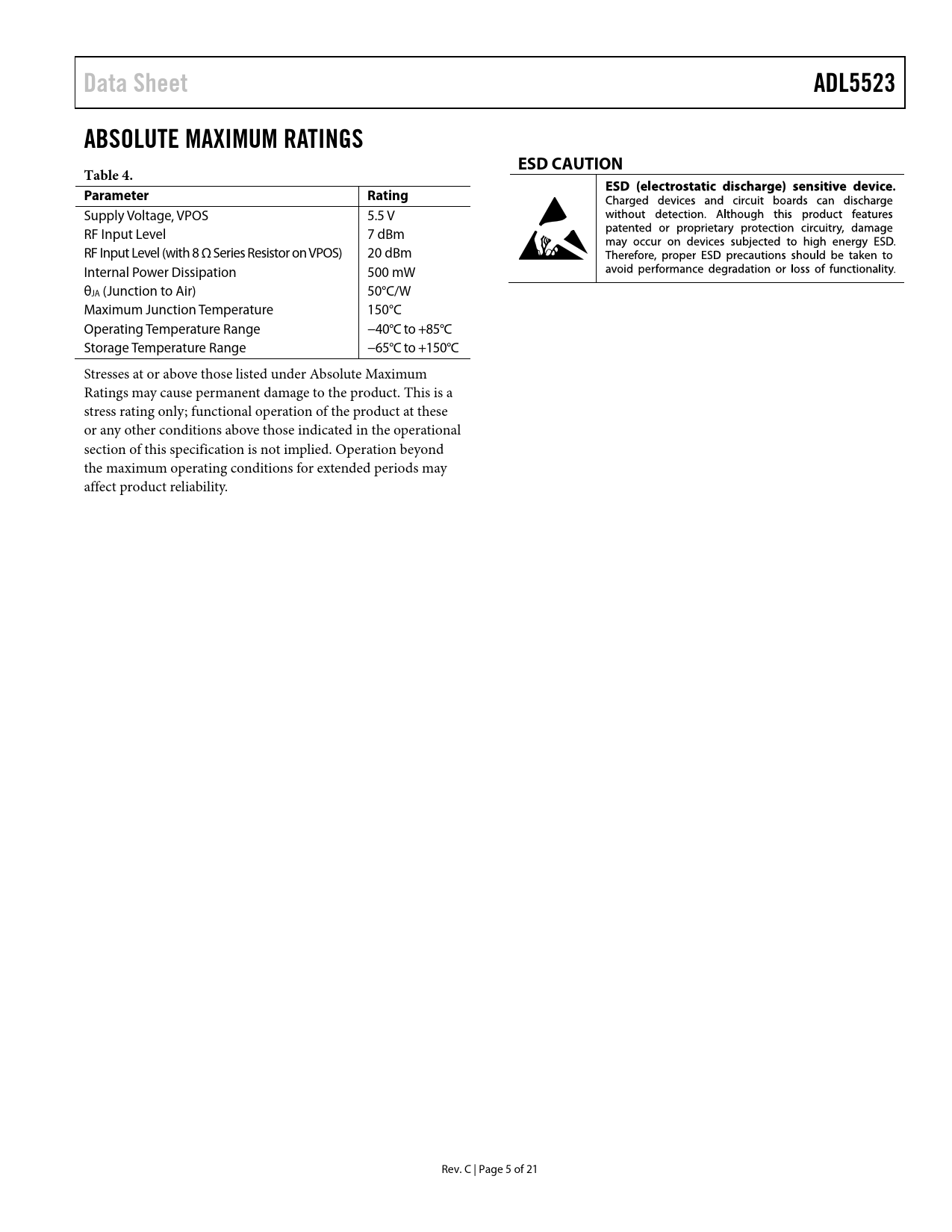 Data SheetADL5523ABSOLUTE MAXIMUM RATINGSESD CAUTIONTable 4. Parameter Rating Supply Voltage, VPOS 5.5 V RF Input Level 7 dBm RF Input Level (with 8 Ω Series Resistor on VPOS) 20 dBm Internal Power Dissipation 500 mW θJA (Junction to Air) 50°C/W Maximum Junction Temperature 150°C Operating Temperature Range −40°C to +85°C Storage Temperature Range −65°C to +150°C Stresses at or above those listed under Absolute Maximum Ratings may cause permanent damage to the product. This is a stress rating only; functional operation of the product at these or any other conditions above those indicated in the operational section of this specification is not implied. Operation beyond the maximum operating conditions for extended periods may affect product reliability. Rev. C | Page 5 of 21 Document Outline FEATURES FUNCTIONAL BLOCK DIAGRAM GENERAL DESCRIPTION TABLE OF CONTENTS REVISION HISTORY SPECIFICATIONS AC SPECIFICATIONS DC SPECIFICATIONS DE-EMBEDDED S-PARAMETERS, VPOS = 3 V TO 5 V, RFIN = PORT 1, VPOS = PORT 2, RFOUT = PORT 3 ABSOLUTE MAXIMUM RATINGS ESD CAUTION PIN CONFIGURATION AND FUNCTION DESCRIPTIONS TYPICAL PERFORMANCE CHARACTERISTICS 900 MHz, VPOS = 5 V 1950 MHZ, VPOS = 5 V 2600 MHz, VPOS = 5 V 3500 MHz, VPOS = 5 V 900 MHz, VPOS = 3 V 1950 MHz, VPOS = 3 V 2600 MHz, VPOS = 3 V 3500 MHz, VPOS = 3 V DC CHARACTERISTICS BASIC CONNECTIONS EVALUATION BOARD SOLDERING INFORMATION AND RECOMMENDED PCB LAND PATTERN TUNING THE ADL5523 FOR OPTIMAL NOISE FIGURE TUNING S22 TUNING THE LNA INPUT FOR OPTIMAL GAIN TUNING THE LNA INPUT FOR OPTIMAL NOISE FIGURE S11 OF THE LNA WITH S22 MATCHED OUTLINE DIMENSIONS ORDERING GUIDE