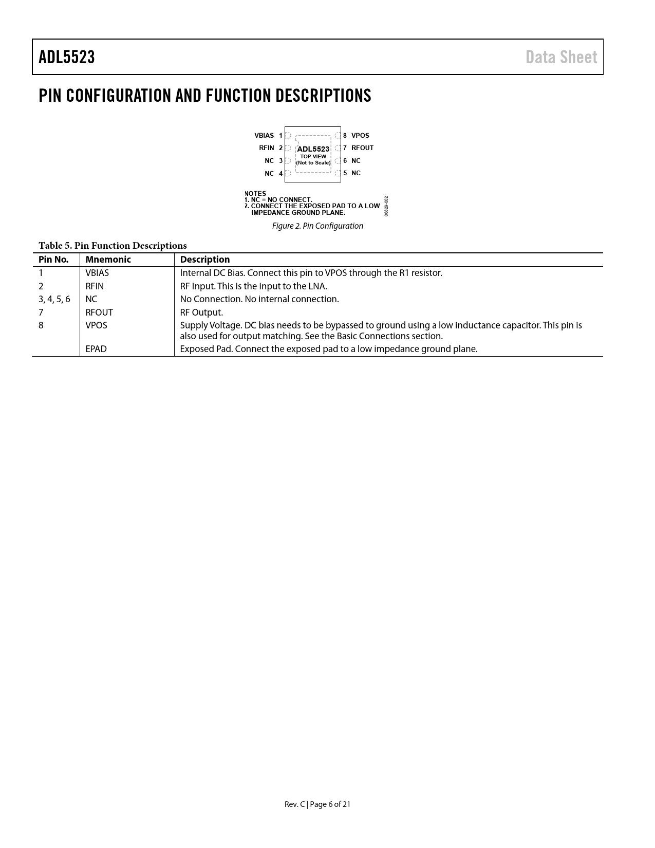 ADL5523. Data Sheet. PIN CONFIGURATION AND FUNCTION DESCRIPTIONS. VBIAS 1. 8 VPOS. RFIN 2. 7 RFOUT. TOP VIEW. NC 3. (Not to Scale). 6 NC