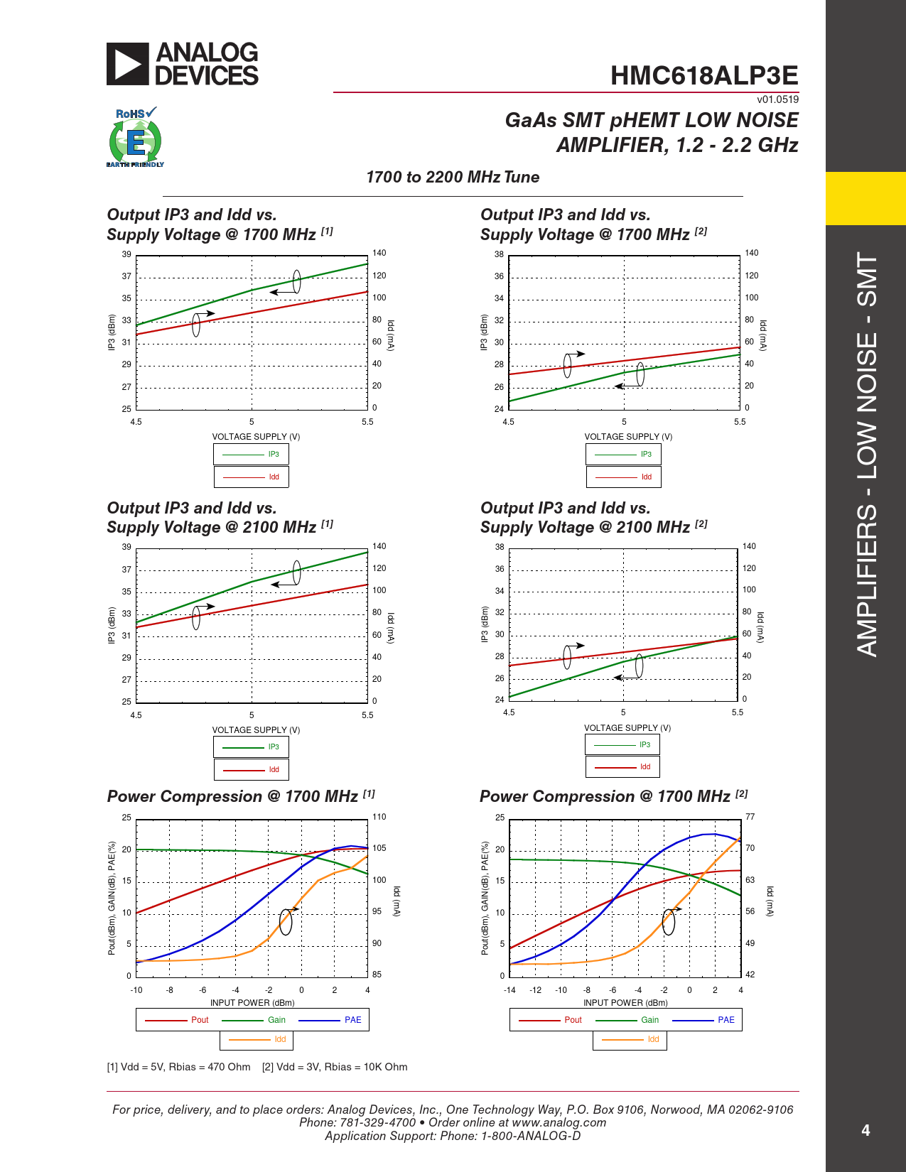 HMC618ALP3E. GaAs SMT pHEMT LOW NOISE. AMPLIFIER, 1.2 - 2.2 GHz. 1700 to 2200 MHz Tune. Output IP3 and Idd vs