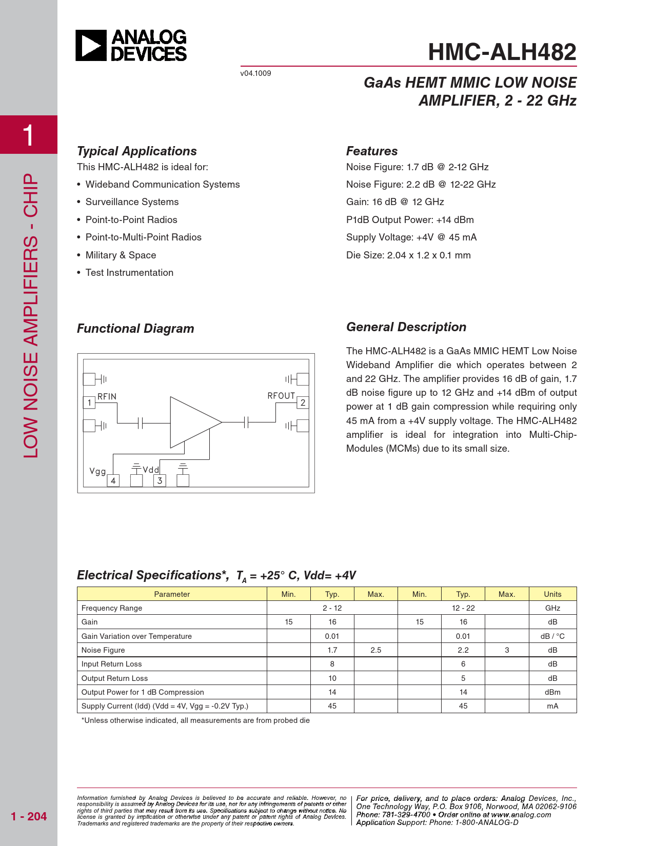 HMC-ALH482 v04.1009 GaAs HEMT MMIC LOW NOISEAMPLIFIER, 2 - 22 GHz 1 Typical ApplicationsFeatures This HMC-ALH482 is ideal for: Noise Figure: 1.7 dB @ 2-12 GHz IP • Wideband Communication Systems Noise Figure: 2.2 dB @ 12-22 GHz H • Surveillance Systems Gain: 16 dB @ 12 GHz C • Point-to-Point Radios P1dB Output Power: +14 dBm - • Point-to-Multi-Point Radios Supply Voltage: +4V @ 45 mA RS • Military & Space Die Size: 2.04 x 1.2 x 0.1 mm IE • Test Instrumentation IF L P M Functional DiagramGeneral Description A E The HMC-ALH482 is a GaAs MMIC HEMT Low Noise Wideband Amplifi er die which operates between 2 IS and 22 GHz. The amplifi er provides 16 dB of gain, 1.7 O dB noise fi gure up to 12 GHz and +14 dBm of output N power at 1 dB gain compression while requiring only W 45 mA from a +4V supply voltage. The HMC-ALH482 amplifi er is ideal for integration into Multi-Chip- O L Modules (MCMs) due to its small size. Electrical Specifi cations*, T = +25° C, Vdd= +4VA Parameter Min. Typ. Max. Min. Typ. Max. Units Frequency Range 2 - 12 12 - 22 GHz Gain 15 16 15 16 dB Gain Variation over Temperature 0.01 0.01 dB / °C Noise Figure 1.7 2.5 2.2 3 dB Input Return Loss 8 6 dB Output Return Loss 10 5 dB Output Power for 1 dB Compression 14 14 dBm Supply Current (Idd) (Vdd = 4V, Vgg = -0.2V Typ.) 45 45 mA *Unless otherwise indicated, all measurements are from probed die Information furnish F ed obr pri y Anal ce, de og Device li s vie s r beyli, a eve nd to pla d to be accura ce o te and rder reliabl s e , pl . Ho ease co wever, no For price, delivery, and to place orders: Analog Devices, Inc., responsibility is assumed by Analog Devices for its use, nor for any infringements of patents or other ntact Hittite Microwave Corporation: One Technology Way, P.O. Box 9106, Norwood, MA 02062-9106 rights of third parties that may result from its use. Specifications subject to change without notice. No 1 - 204 20 Alpha Road, Chelmsford, MA 01824 Phone: 978 Phon - e 25 : 7 0 81--3 32 3 9 4 - 3 F 70 ax 0 • O : 978 rder on -li25 n 0 e a - t 33 ww 73 license is granted by implication or otherwise under any patent or patent rights of Analog Devices. w.analog.com Order On Trademarks and registered trademarks are the property of their respective owners. -line at www.h A it p tpite.co licatio m n Support: Phone: 1-800-ANALOG-D