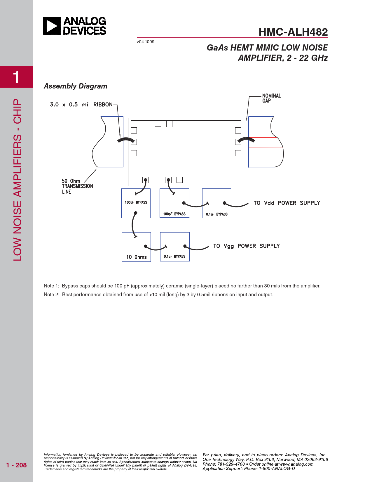 HMC-ALH482 v04.1009 GaAs HEMT MMIC LOW NOISEAMPLIFIER, 2 - 22 GHz 1 Assembly Diagram IP H C - RS IE IF L P M A E IS O N W O L Note 1: Bypass caps should be 100 pF (approximately) ceramic (single-layer) placed no farther than 30 mils from the amplifi er. Note 2: Best performance obtained from use of <10 mil (long) by 3 by 0.5mil ribbons on input and output. Information furnish F ed obr pri y Anal ce, de og Device li s vie s r beyli, a eve nd to pla d to be accura ce o te and rder reliabl s e , pl . Ho ease co wever, no For price, delivery, and to place orders: Analog Devices, Inc., responsibility is assumed by Analog Devices for its use, nor for any infringements of patents or other ntact Hittite Microwave Corporation: One Technology Way, P.O. Box 9106, Norwood, MA 02062-9106 rights of third parties that may result from its use. Specifications subject to change without notice. No 1 - 208 20 Alpha Road, Chelmsford, MA 01824 Phone: 978 Phon - e 25 : 7 0 81--3 32 3 9 4 - 3 F 70 ax 0 • O : 978 rder on -li25 n 0 e a - t 33 ww 73 license is granted by implication or otherwise under any patent or patent rights of Analog Devices. w.analog.com Order On Trademarks and registered trademarks are the property of their respective owners. -line at www.h A it p tpite.co licatio m n Support: Phone: 1-800-ANALOG-D