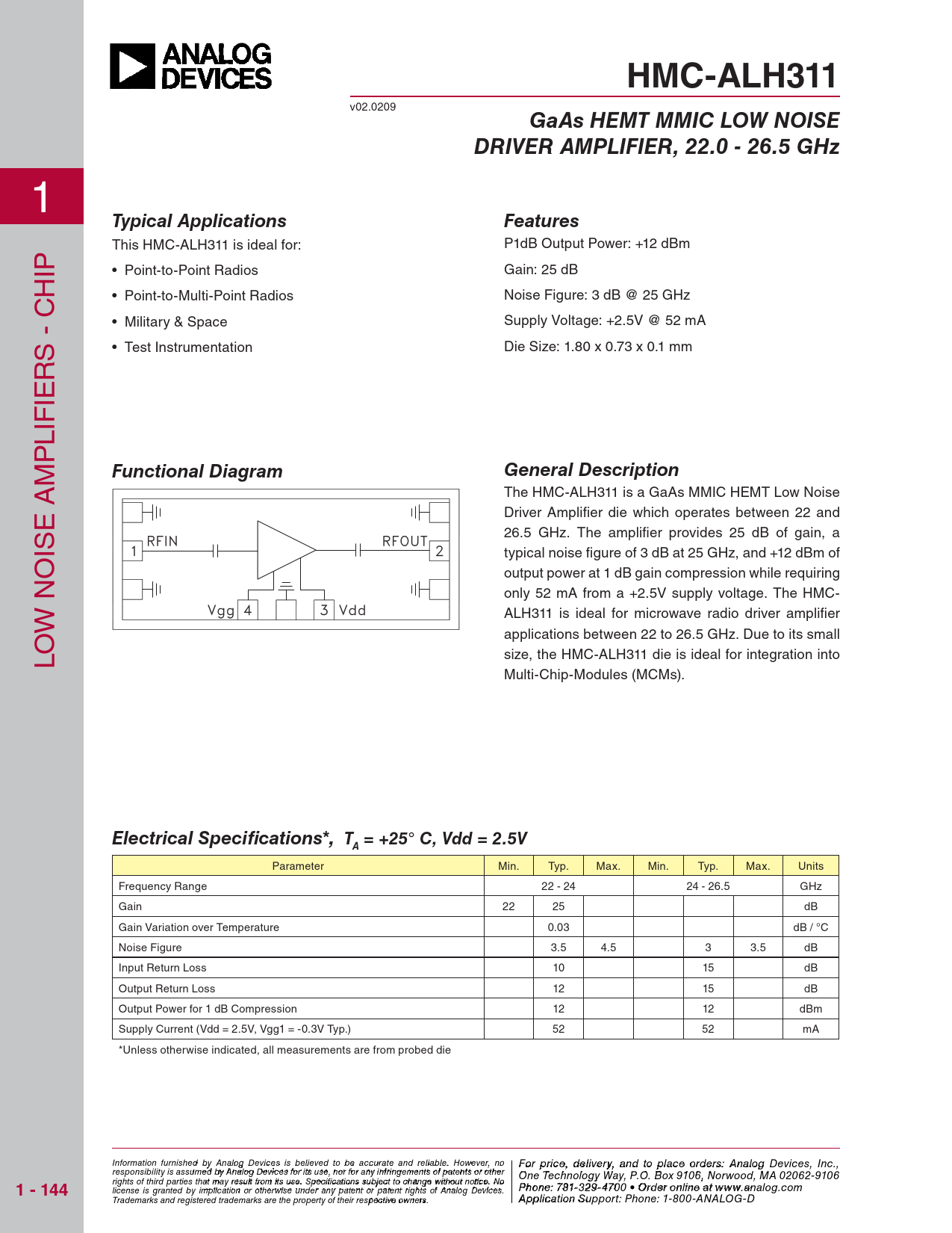 A The HMC-ALH311 is a GaAs MMIC HEMT Low Noise E Driver Amplifi er die which operates between 22 and 26.5 GHz. The amplifi er provides 25 dB of gain, a IS typical noise fi gure of 3 dB at 25 GHz, and +12 dBm of O output power at 1 dB gain compression while requiring N only 52 mA from a +2.5V supply voltage. The HMC- W ALH311 is ideal for microwave radio driver amplifi er O applications between 22 to 26.5 GHz. Due to its small L size, the HMC-ALH311 die is ideal for integration into Multi-Chip-Modules (MCMs).