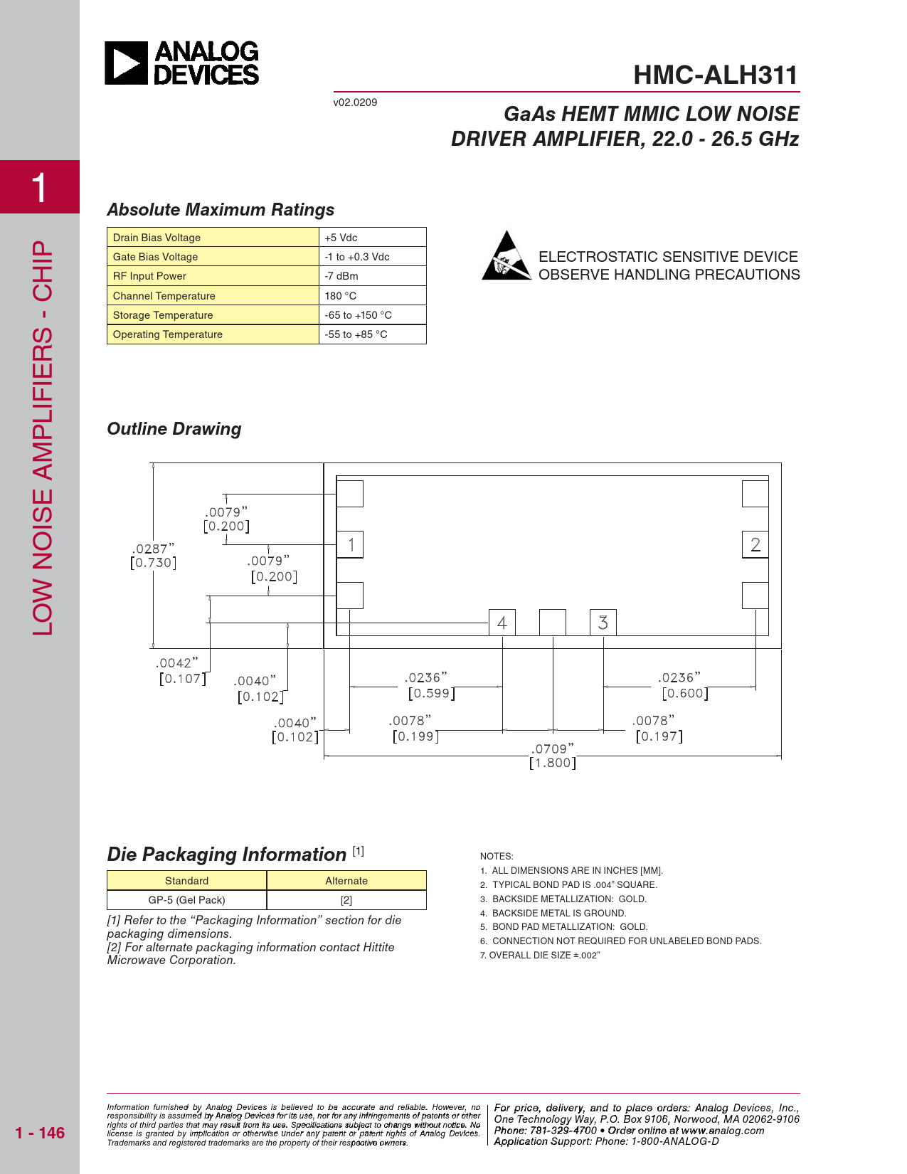 HMC-ALH311. GaAs HEMT MMIC LOW NOISE. DRIVER AMPLIFIER, 22.0 - 26.5 GHz. Absolute Maximum Ratings. Outline Drawing