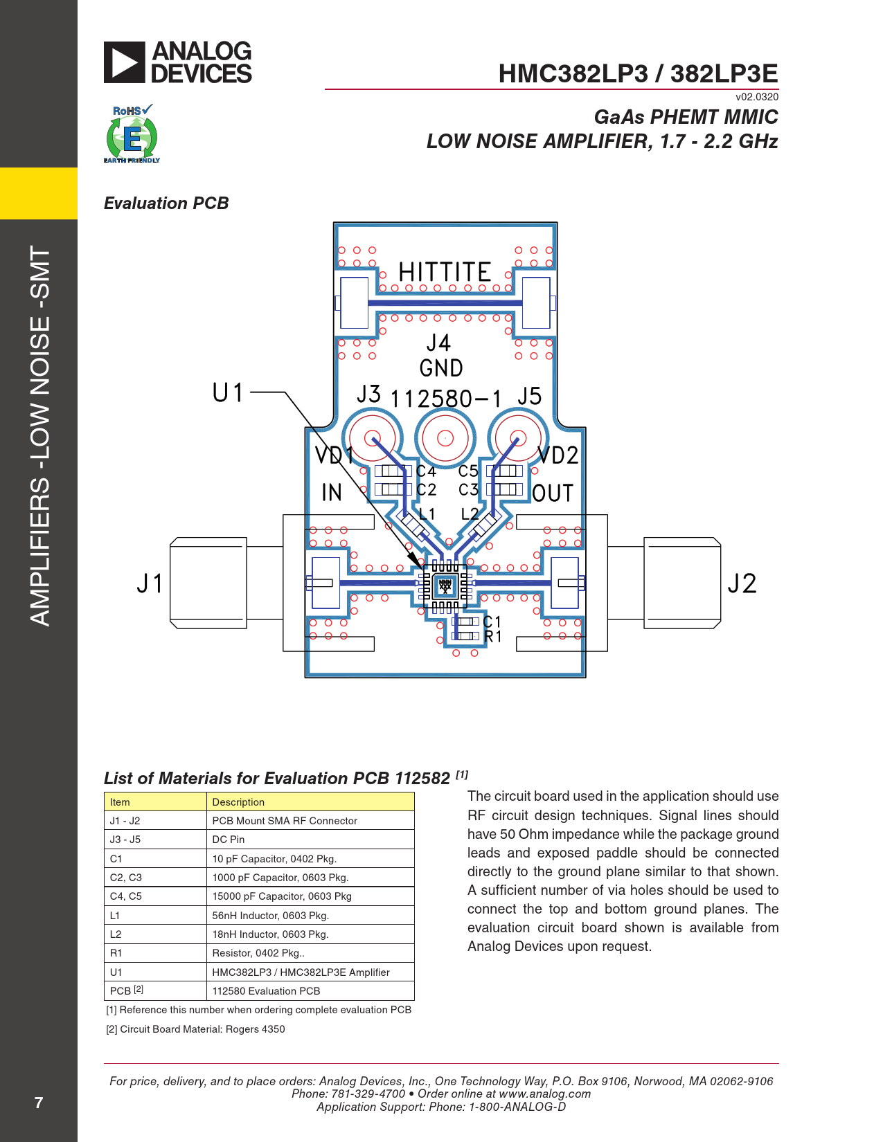 HMC382LP3 / 382LP3E v02.0320 GaAs PHEMT MMICLOW NOISE AMPLIFIER, 1.7 - 2.2 GHzEvaluation PCB T M S - E IS O N W LO - S R IE LIF P M A List of Materials for Evaluation PCB 112582 [1] Item Description The circuit board used in the application should use J1 - J2 PCB Mount SMA RF Connector RF circuit design techniques. Signal lines should have 50 Ohm impedance while the package ground J3 - J5 DC Pin leads and exposed paddle should be connected C1 10 pF Capacitor, 0402 Pkg. directly to the ground plane similar to that shown. C2, C3 1000 pF Capacitor, 0603 Pkg. A sufficient number of via holes should be used to C4, C5 15000 pF Capacitor, 0603 Pkg connect the top and bottom ground planes. The L1 56nH Inductor, 0603 Pkg. evaluation circuit board shown is available from L2 18nH Inductor, 0603 Pkg. Analog Devices upon request. R1 Resistor, 0402 Pkg.. U1 HMC382LP3 / HMC382LP3E Amplifier PCB [2] 112580 Evaluation PCB [1] Reference this number when ordering complete evaluation PCB [2] Circuit Board Material: Rogers 4350 For price, delivery, and to place orders: Analog Devices, Inc., One Technology Way, P.O. Box 9106, Norwood, MA 02062-9106 Phone: 781-329-4700 • Order online at www.analog.com 7 Application Support: Phone: 1-800-ANALOG-D