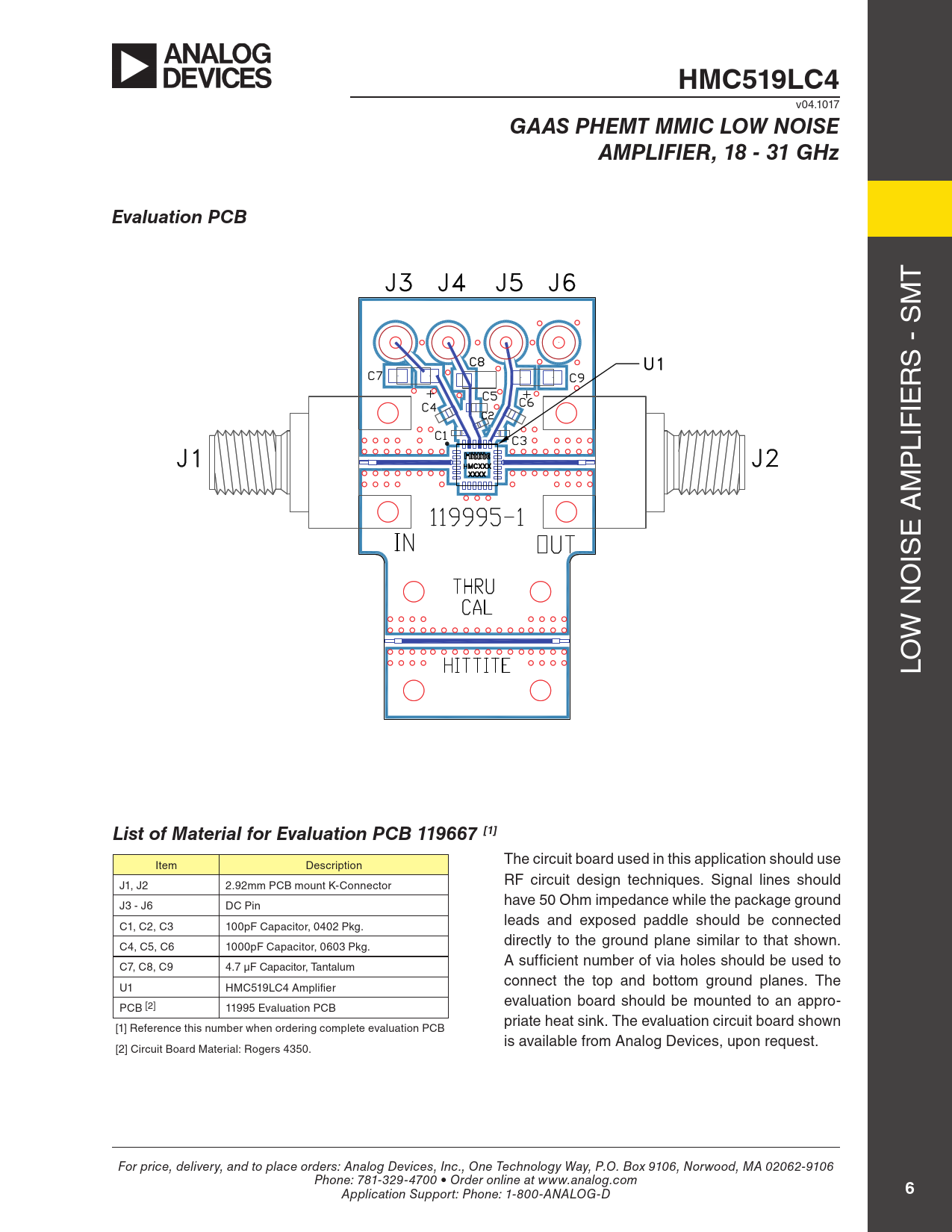 HMC519LC4 v04.1017 Gaas PHEMT MMIC LOW NOIsEaMPLIFIER, 18 - 31 GHzEvaluation PCB T M S - S R IE LIF P M E A IS O W N LO List of Material for Evaluation PCB 119667 [1] Item Description The circuit board used in this application should use J1, J2 2.92mm PCB mount K-Connector RF circuit design techniques. Signal lines should have 50 Ohm impedance while the package ground J3 - J6 DC Pin leads and exposed paddle should be connected C1, C2, C3 100pF Capacitor, 0402 Pkg. directly to the ground plane similar to that shown. C4, C5, C6 1000pF Capacitor, 0603 Pkg. A sufficient number of via holes should be used to C7, C8, C9 4.7 µF Capacitor, Tantalum connect the top and bottom ground planes. The U1 HMC519LC4 Amplifier evaluation board should be mounted to an appro- PCB [2] 11995 Evaluation PCB priate heat sink. The evaluation circuit board shown [1] Reference this number when ordering complete evaluation PCB is available from Analog Devices, upon request. [2] Circuit Board Material: Rogers 4350. For price, delivery, and to place orders: Analog Devices, Inc., One Technology Way, P.O. Box 9106, Norwood, MA 02062-9106 Phone: 781-329-4700 • Order online at www.analog.com 6 Application Support: Phone: 1-800-ANALOG-D