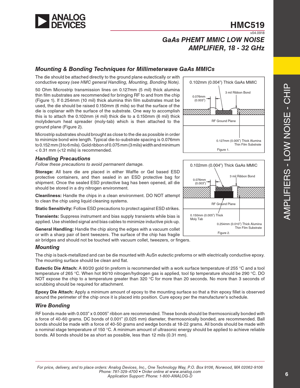 HMC519 v04.0918 GaAs PHEMT MMIC LOW NOISEAMPLIFIER, 18 - 32 GHzMounting & Bonding Techniques for Millimeterwave GaAs MMICs The die should be attached directly to the ground plane eutectical y or with conductive epoxy (see HMC general Handling, Mounting, Bonding Note). 0.102mm (0.004”) Thick GaAs MMIC 50 Ohm Microstrip transmission lines on 0.127mm (5 mil) thick alumina IP thin film substrates are recommended for bringing RF to and from the chip 3 mil Ribbon Bond 0.076mm H (Figure 1). If 0.254mm (10 mil) thick alumina thin film substrates must be (0.003”) used, the die should be raised 0.150mm (6 mils) so that the surface of the die is coplanar with the surface of the substrate. One way to accomplish this is to attach the 0.102mm (4 mil) thick die to a 0.150mm (6 mil) thick E - C molybdenum heat spreader (moly-tab) which is then attached to the RF Ground Plane IS ground plane (Figure 2). O Microstrip substrates should brought as close to the die as possible in order to minimize bond wire length. Typical die-to-substrate spacing is 0.076mm 0.127mm (0.005”) Thick Alumina to 0.152 mm (3 to 6 mils). Gold ribbon of 0.075 mm (3 mils) width and minimum Thin Film Substrate < 0.31 mm (<12 mils) is recommended. Figure 1. W N O Handling Precautions Follow these precautions to avoid permanent damage. 0.102mm (0.004”) Thick GaAs MMIC Storage: All bare die are placed in either Waffle or Gel based ESD S - L protective containers, and then sealed in an ESD protective bag for 3 mil Ribbon Bond 0.076mm R shipment. Once the sealed ESD protective bag has been opened, all die (0.003”) should be stored in a dry nitrogen environment. IE Cleanliness: Handle the chips in a clean environment. DO NOT attempt to clean the chip using liquid cleaning systems. LIF RF Ground Plane P Static Sensitivity: Fol ow ESD precautions to protect against ESD strikes. M Transients: Suppress instrument and bias supply transients while bias is 0.150mm (0.005”) Thick Moly Tab A applied. Use shielded signal and bias cables to minimize inductive pick-up. 0.254mm (0.010”) Thick Alumina General Handling: Handle the chip along the edges with a vacuum col et Thin Film Substrate or with a sharp pair of bent tweezers. The surface of the chip has fragile Figure 2. air bridges and should not be touched with vacuum col et, tweezers, or fingers. Mounting The chip is back-metal ized and can be die mounted with AuSn eutectic preforms or with electrical y conductive epoxy. The mounting surface should be clean and flat. Eutectic Die Attach: A 80/20 gold tin preform is recommended with a work surface temperature of 255 °C and a tool temperature of 265 °C. When hot 90/10 nitrogen/hydrogen gas is applied, tool tip temperature should be 290 °C. DO NOT expose the chip to a temperature greater than 320 °C for more than 20 seconds. No more than 3 seconds of scrubbing should be required for attachment. Epoxy Die Attach: Apply a minimum amount of epoxy to the mounting surface so that a thin epoxy fil et is observed around the perimeter of the chip once it is placed into position. Cure epoxy per the manufacturer’s schedule. Wire Bonding RF bonds made with 0.003” x 0.0005” ribbon are recommended. These bonds should be thermosonical y bonded with a force of 40-60 grams. DC bonds of 0.001” (0.025 mm) diameter, thermosonical y bonded, are recommended. Ball bonds should be made with a force of 40-50 grams and wedge bonds at 18-22 grams. All bonds should be made with a nominal stage temperature of 150 °C. A minimum amount of ultrasonic energy should be applied to achieve reliable bonds. All bonds should be as short as possible, less than 12 mils (0.31 mm). For price, delivery, and to place orders: Analog Devices, Inc., One Technology Way, P.O. Box 9106, Norwood, MA 02062-9106 Phone: 781-329-4700 • Order online at www.analog.com Application Support: Phone: 1-800-ANALOG-D 6