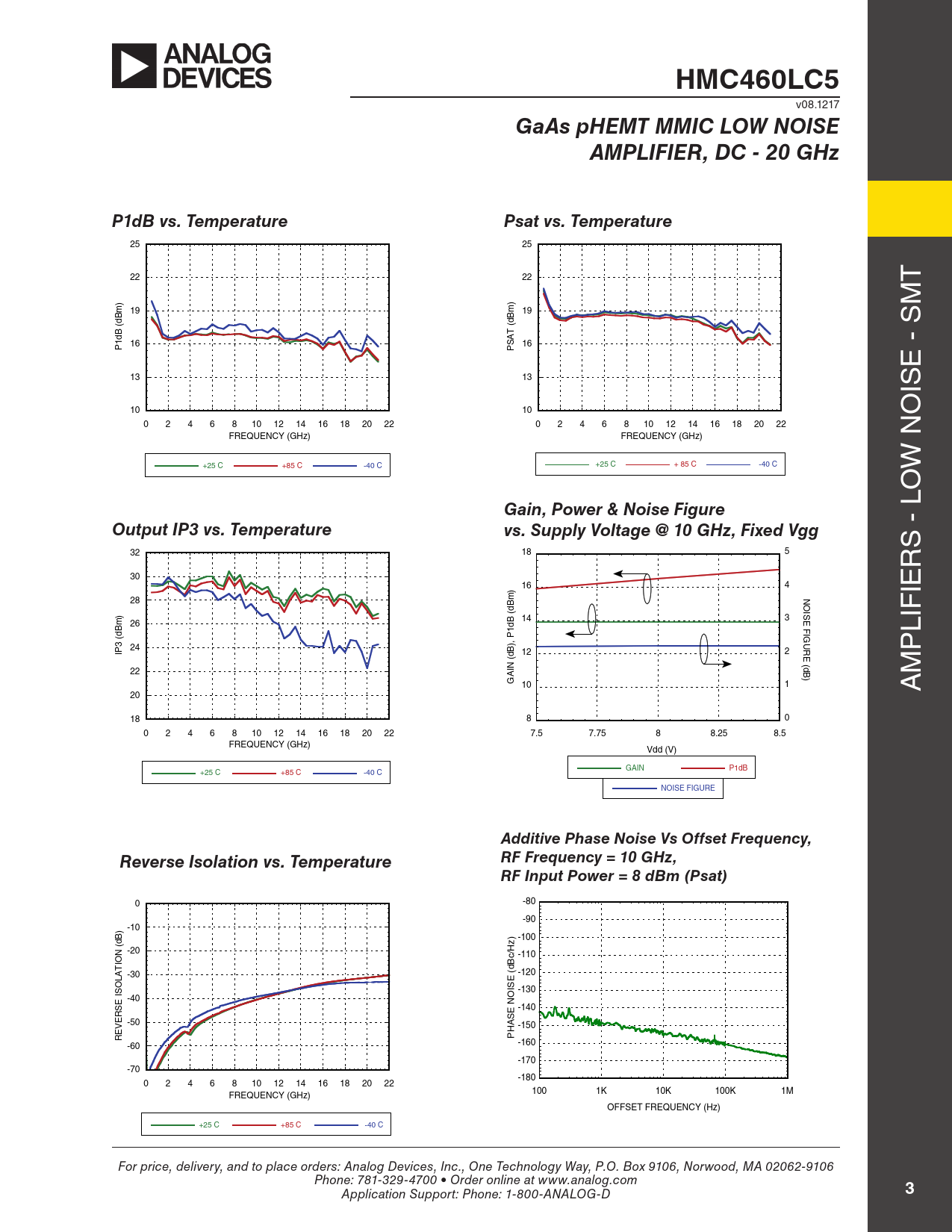 HMC460LC5 v08.1217 GaAs pHEMT MMIC LOW NOISEAMPLIFIER, DC - 20 GHzP1dB vs. TemperaturePsat vs. Temperature 25 25 22 22 T M 19 19 (dBm) (dBm) 16 P1dB 16 PSAT E - S 13 13 IS 10 10 O 0 2 4 6 8 10 12 14 16 18 20 22 0 2 4 6 8 10 12 14 16 18 20 22 FREQUENCY (GHz) FREQUENCY (GHz) +25 C +85 C -40 C +25 C + 85 C -40 C W N O Gain, Power & Noise FigureOutput IP3 vs. Temperaturevs. Supply Voltage @ 10 GHz, Fixed Vgg 5 S - L 32 18 R 30 16 4 ) N IE 28 m O I ) (dB S 3 E 26 14 1dB F IG LIF (dBm U 24 ), P IP3 12 2 R E P (dB (d 22 IN A B ) M G 10 1 20 A 18 8 0 0 2 4 6 8 10 12 14 16 18 20 22 7.5 7.75 8 8.25 8.5 FREQUENCY (GHz) Vdd (V) GAIN P1dB +25 C +85 C -40 C NOISE FIGURE Additive Phase Noise Vs Offset Frequency,Reverse Isolation vs. TemperatureRF Frequency = 10 GHz, RF Input Power = 8 dBm (Psat) 0 -80 -90 -10 ) -100 (dB) z -20 /H -110 Bc -30 (d -120 ISE ISOLATION -130 -40 O N -140 -50 ASE -150 REVERSE PH -60 -160 -170 -70 -180 0 2 4 6 8 10 12 14 16 18 20 22 FREQUENCY (GHz) 100 1K 10K 100K 1M OFFSET FREQUENCY (Hz) +25 C +85 C -40 C For price, delivery, and to place orders: Analog Devices, Inc., One Technology Way, P.O. Box 9106, Norwood, MA 02062-9106 Phone: 781-329-4700 • Order online at www.analog.com Application Support: Phone: 1-800-ANALOG-D 3 Document Outline Typical Applications Features Functional Diagram General Description Electrical Specifications Broadband Gain & Return Loss Gain vs. Temperature Input Return Loss vs. Temperature Output Return Loss vs. Temperature Low Frequency Gain & Return Loss Noise Figure vs. Temperature P1dB vs. Temperature Psat vs. Temperature Output IP3 vs. Temperature Gain, Power & Noise Figure vs. Supply Voltage @ 10 GHz, Fixed Vgg Reverse Isolation vs. Temperature Absolute Maximum Ratings Typical Supply Current vs. Vdd Outline Drawing