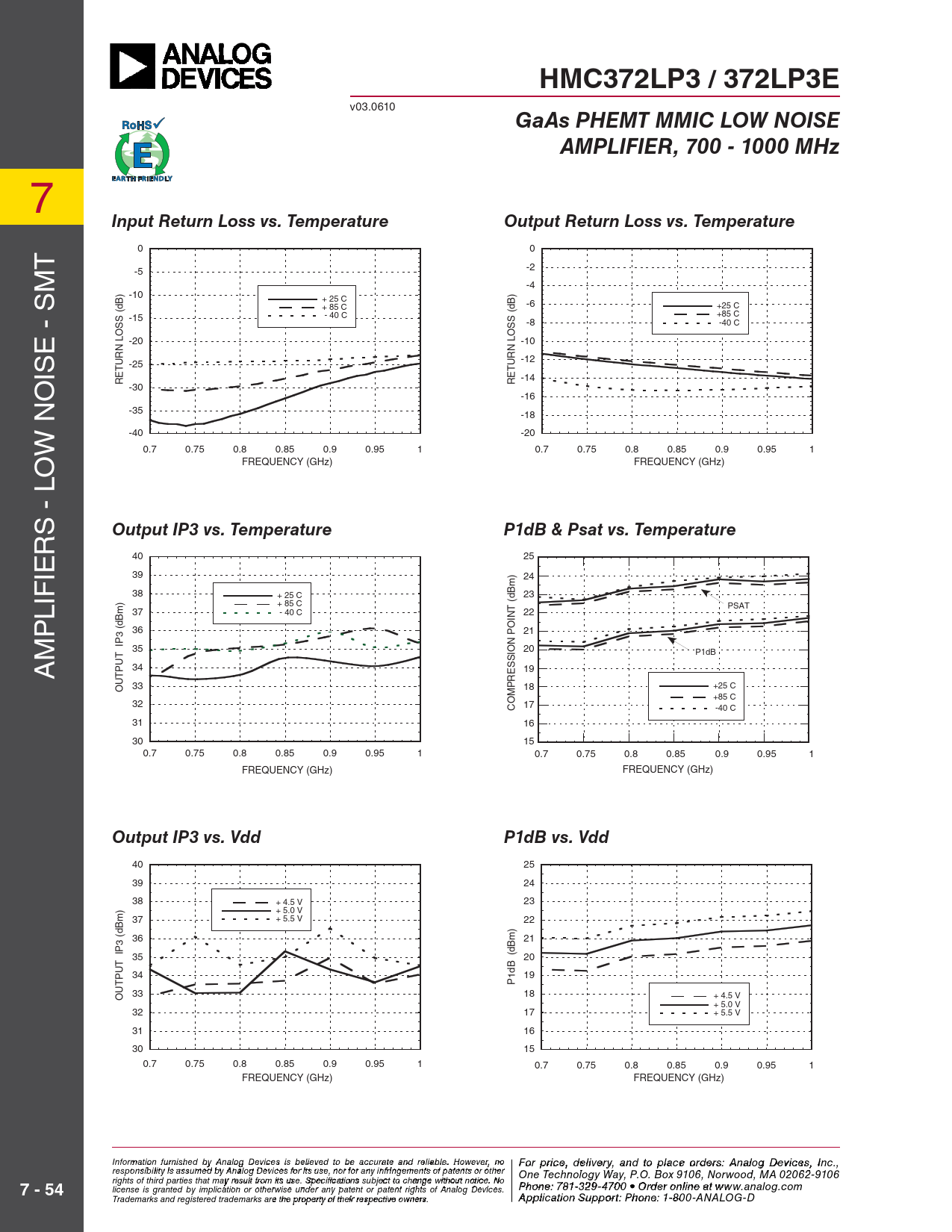 HMC372LP3 / 372LP3E v03.0610 GaAs PHEMT MMIC LOW NOISEAMPLIFIER, 700 - 1000 MHz 7 Input Return Loss vs. TemperatureOutput Return Loss vs. Temperature 0 0 T -2 -5 -4 -10 + 25 C -6 + 85 C +25 C - 40 C +85 C -15 -8 -40 C E - SM -20 -10 -12 IS -25 -14 RETURN LOSS (dB) RETURN LOSS (dB) -30 -16 -35 -18 -40 -20 W NO 0.7 0.75 0.8 0.85 0.9 0.95 1 0.7 0.75 0.8 0.85 0.9 0.95 1 O FREQUENCY (GHz) FREQUENCY (GHz) - L S Output IP3 vs. TemperatureP1dB & Psat vs. Temperature R 40 25 IE 39 24 IF 38 + 25 C 23 L + 85 C PSAT 37 - 40 C 22 P 36 21 M 35 20 P1dB A 34 19 33 18 +25 C OUTPUT IP3 (dBm) +85 C 32 17 COMPRESSION POINT (dBm) -40 C 31 16 30 15 0.7 0.75 0.8 0.85 0.9 0.95 1 0.7 0.75 0.8 0.85 0.9 0.95 1 FREQUENCY (GHz) FREQUENCY (GHz) Output IP3 vs. VddP1dB vs. Vdd 40 25 39 24 38 + 4.5 V 23 + 5.0 V 37 + 5.5 V 22 36 21 35 20 34 19 P1dB (dBm) 33 18 + 4.5 V OUTPUT IP3 (dBm) + 5.0 V 32 17 + 5.5 V 31 16 30 15 0.7 0.75 0.8 0.85 0.9 0.95 1 0.7 0.75 0.8 0.85 0.9 0.95 1 FREQUENCY (GHz) FREQUENCY (GHz) Info F rmoatr pr ion f iurcne, de ished b ly iv A e n r al y o a g D n evd to p ices is bla eli c eve o ed t rde o be ras: H ccuratite tiatne M d reli iacr ble ow . Ho av wev e C er, n o o rpo Fora r t p iro ic n e ,, 2 d 0 eli A ve lrpha R y, and toad, C o place hoel rd m er s s fo : Ard, MA 01 nalog Devic 8 e 2 s 4 , Inc., responsibility is assumed by Analog Devices for its use, nor for any infringements of patents or other One Technology Way, P.O. Box 9106, Norwood, MA 02062-9106 Phone: 978-250-3343 Fax: 978-250-3373 O rights of third parties that may result from its use. Specifications subject to change without notice. No P rde hone r O : 7 n 81- -3li 2n 9 e a -47 t w 0 w 0 • O w rd .ehit r o t nilte in .c e ao t m 7 - 54 license is granted by implication or otherwise under any patent or patent rights of Analog Devices. www.analog.com Application Support: Pho Trademarks and registered trademarks are the property of their respective owners. ne: 978-250-33 A 4 p 3 o plica r app tion Su s p @ po h rt itt : P ite ho .c ne o : 1m -800-ANALOG-D