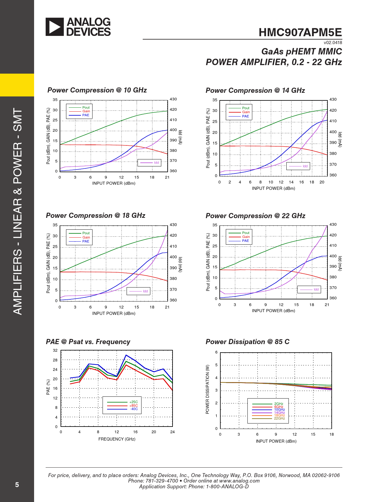 HMC907APM5E v02.0418 GaAs pHEMT MMICPOWER AMPLIFIER, 0.2 - 22 GHzPower Compression @ 10 GHzPower Compression @ 14 GHz 35 430 35 430 T Pout Pout 30 420 Gain 30 420 (%) Gain M PAE E (%) PAE A E 25 410 A 25 410 ), P B ), P I 20 400 d B (d d I 20 400 d IN ( (d d m IN (m R - S GA 15 390 A) A ), GA 15 390 ) E m ), B 10 380 m (d B 380 t 10 (d W u o 5 370 t P Idd u o 5 370 O Idd P 0 360 360 0 3 6 9 12 15 18 21 0 INPUT POWER (dBm) 0 2 4 6 8 10 12 14 16 18 20 INPUT POWER (dBm) R & P A E Power Compression @ 18 GHzPower Compression @ 22 GHz IN 35 430 35 430 Pout Pout 30 420 30 420 Gain Gain (%) (%) PAE E PAE E A A 410 S - L 25 410 25 ), P ), P B R B I I 20 400 d 20 400 d (d d (d d IN ( m IN m IE 390 A GA 15 390 A GA 15 ) ), ), m m B B 380 10 380 10 LIF (d (d t t u u o P o 370 5 370 5 Idd P Idd P M 0 360 0 360 A 0 3 6 9 12 15 18 21 0 3 6 9 12 15 18 21 INPUT POWER (dBm) INPUT POWER (dBm) PAE @ Psat vs. FrequencyPower Dissipation @ 85 C 32 6 28 ) 5 24 (W N ) 20 IO 4 (% PAT 16 3 PAE ISSI 12 D +25C ER 2 2GHz +85C 8 W 6GHz -40C 10GHz PO 14GHz 4 1 18GHz 22GHz 0 0 0 4 8 12 16 20 24 0 3 6 9 12 15 18 FREQUENCY (GHz) INPUT POWER (dBm) For price, delivery, and to place orders: Analog Devices, Inc., One Technology Way, P.O. Box 9106, Norwood, MA 02062-9106 Phone: 781-329-4700 • Order online at www.analog.com 5 Application Support: Phone: 1-800-ANALOG-D Document Outline Typical Applications Functional Diagram General Description Electrical Specifications Gain & Return Loss Absolute Maximum Ratings Outline Drawing Package Information Pin Descriptions