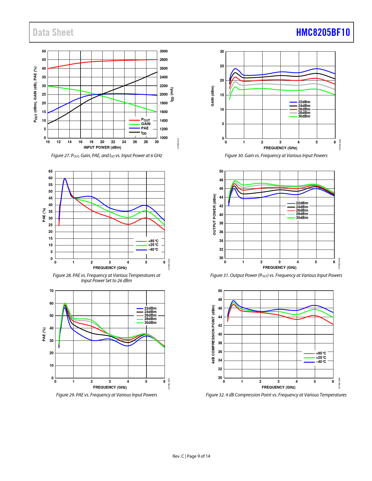 Data SheetHMC8205BF105030003045280025402600%) ( AE352400, P20B)302200)dmN (B252000mA)AI((d15, GI DDIN201800A22dBmG24dBmBm) d1026dBm(15160028dBmUT30dBmO10POUT1400PGAIN55PAE1200IDD010000 041 10121416182022242628300123456 044 INPUT POWER (dBm) 13790- FREQUENCY (GHz) 13790- Figure 27. POUT, Gain, PAE, and IDD vs. Input Power at 6 GHz Figure 30. Gain vs. Frequency at Various Input Powers 655060485546504544Bm) d4022dBm42)R (24dBmE3526dBmW4028dBmE (%O3030dBmPPA25UT38P20UT36O15+85°C3410+25°C –40°C3250300123456 042 043 0123456FREQUENCY (GHz)FREQUENCY (GHz) 13790- 13790- Figure 28. PAE vs. Frequency at Various Temperatures at Figure 31. Output Power (POUT) vs. Frequency at Various Input Powers Input Power Set to 26 dBm 7050486022dBm4624dBmBm) d5026dBm(4428dBm 30dBmINT O)4240N PE (%IO40SPAS3038RE P M2036+85°CB CO+25°C344d–40°C10320300123456 045 038 0123456FREQUENCY (GHz)FREQUENCY (GHz) 13790- 13790- Figure 29. PAE vs. Frequency at Various Input Powers Figure 32. 4 dB Compression Point vs. Frequency at Various Temperatures Rev. C | Page 9 of 14 Document Outline Features Applications Functional Block Diagram General Description Revision History Specifications Electrical Specifications Absolute Maximum Ratings Thermal Resistance ESD Caution Pin Configuration and Function Descriptions Interface Schematics Typical Performance Characteristics Theory of Operation Applications Information Application Circuit Evaluation PCB Outline Dimensions Ordering Guide
