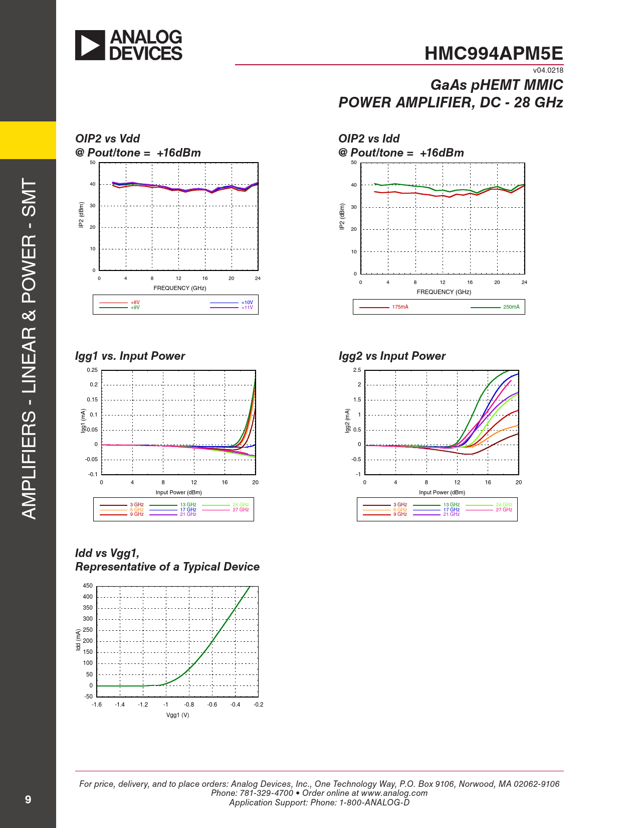 HMC994APM5E v04.0218 GaAs pHEMT MMICPOWER AMPLIFIER, DC - 28 GHzOIP2 vs VddOIP2 vs Idd@ Pout/tone = +16dBm@ Pout/tone = +16dBm 50 50 T 40 40 m s 30 m) 30 m) B B (d (d 2 2 IP 20 IP 20 r - e 10 10 w 0 o 0 0 4 8 12 16 20 24 0 4 8 12 16 20 24 p FREQUENCY (GHz) FREQUENCY (GHz) +8V +10V +9V +11V 175mA 250mA r & A e Igg1 vs. Input PowerIgg2 vs Input Power 0.25 2.5 lin 0.2 2 0.15 1.5 s - ) A 0.1 A 1 r (m (m 0.05 Igg1 0.5 Igg2 ie 0 0 -0.05 -0.5 lif p -0.1 -1 0 4 8 12 16 20 0 4 8 12 16 20 m Input Power (dBm) Input Power (dBm) A 3 GHz 13 GHz 24 GHz 3 GHz 13 GHz 24 GHz 6 GHz 17 GHz 27 GHz 6 GHz 17 GHz 27 GHz 9 GHz 21 GHz 9 GHz 21 GHz Idd vs Vgg1, Representative of a Typical Device 450 400 350 300 ) 250 (mA 200 d Id 150 100 50 0 -50 -1.6 -1.4 -1.2 -1 -0.8 -0.6 -0.4 -0.2 Vgg1 (V) For price, delivery, and to place orders: Analog Devices, Inc., One Technology Way, P.O. Box 9106, Norwood, MA 02062-9106 Phone: 781-329-4700 • Order online at www.analog.com 9 Application Support: Phone: 1-800-ANALOG-D Document Outline Typical Applications Features Functional Diagram General Description Electrical Specifications Performance Characteristics Gain & Return Loss Gain vs. Temperature Input Return Loss vs. Temperature Output Return Loss vs. Temperature Noise Figure vs. Frequency P1dB vs. Temperature Psat vs. Temperature P1dB vs. Vdd Psat vs. Vdd Output IP3 vs. Temperature @ Pout = 18 dBm Tone Power Compression @ 10 GHz Power Dissipation Second Harmonics vs. Temperature @ Pout = 18 dBm Second Harmonics vs. Vdd @ Pout = 18 dBm Second Harmonics vs. Pout Reverse Isolation vs Temperature Absolute Maximum Ratings Typical Supply Current vs. Vdd Outline Drawing Die Packaging Information Pad Descriptions Assembly Diagram Application Circuit
