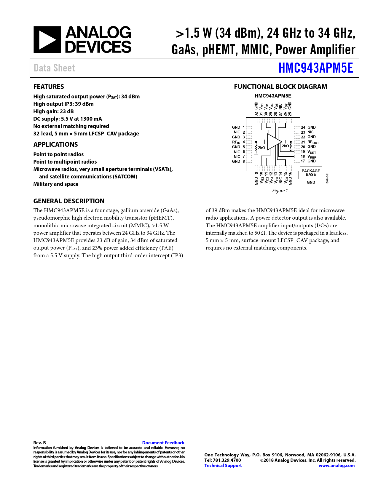 >1.5 W (34 dBm), 24 GHz to 34 GHz,. GaAs, pHEMT, MMIC, Power Amplifier. Data Sheet. HMC943APM5E. FEATURES