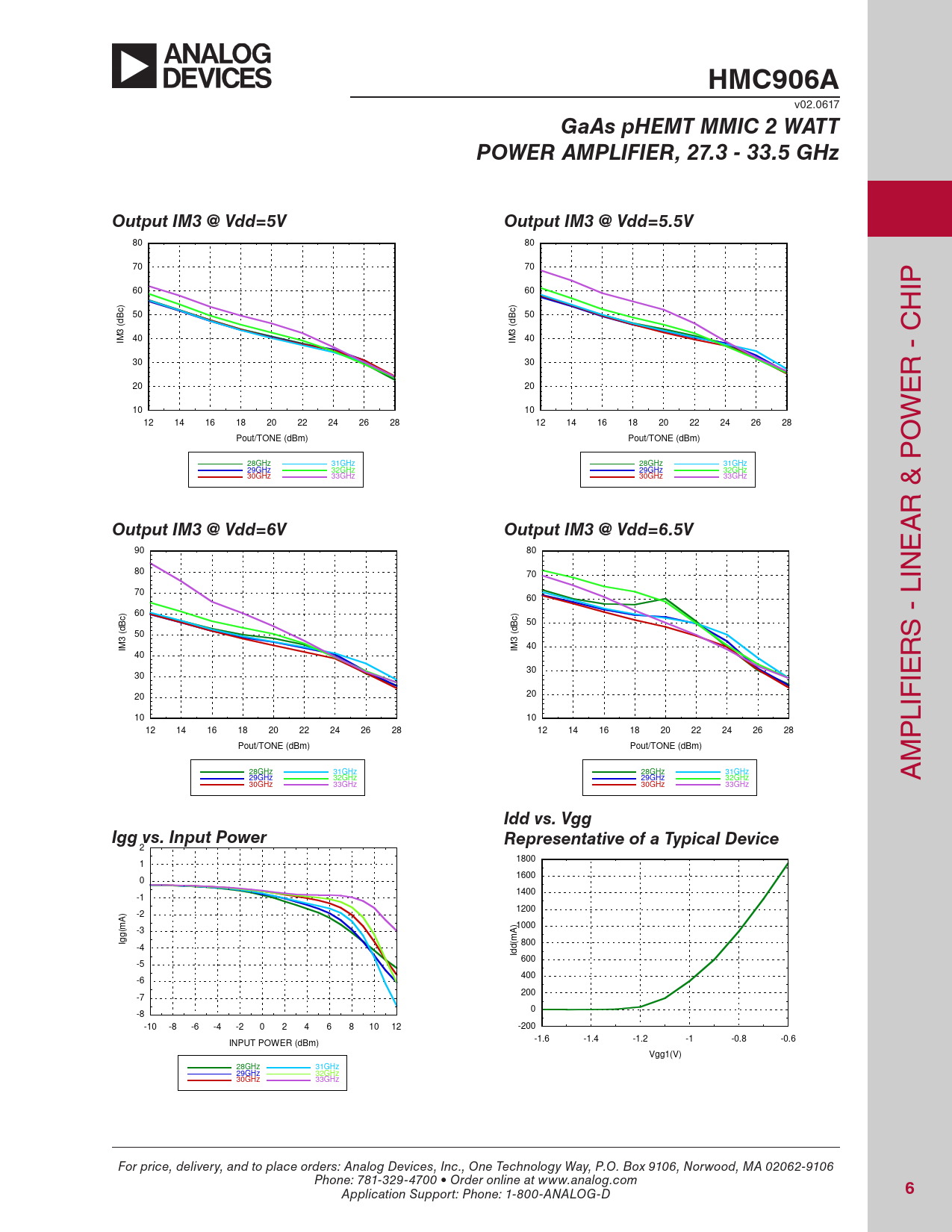 2 1800 1 1600 0 1400 -1 ) 1200 -2 A m 1000 ) -3 A Igg( m 800 -4 Idd( 600 -5 400 -6 200 -7 0 -8 -10 -8 -6 -4 -2 0 2 4 6 8 10 12 -200 -1.6 -1.4 -1.2 -1 -0.8 -0.6 INPUT POWER (dBm) Vgg1(V) 28GHz 31GHz 29GHz 32GHz 30GHz 33GHz For price, delivery, and to place orders: Analog Devices, Inc., One Technology Way, P.O. Box 9106, Norwood, MA 02062-9106 Phone: 781-329-4700 • Order online at www.analog.com Application Support: Phone: 1-800-ANALOG-D